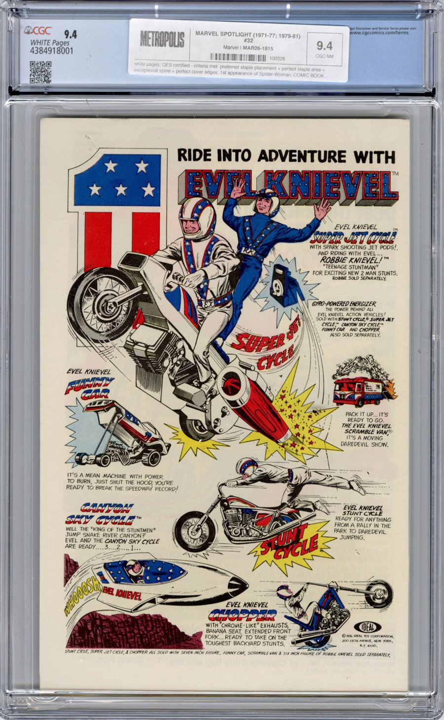 Marvel Spotlight #32 features the origin and first appearance of Spider-Woman (no relation). Originally created by writer Archie Goodwin as a one-off character, the issue did surprisingly well and writer Marv Wolfman was tasked to take on the new heroine. Wolfman gave Spider-Woman the alter-ego of Jessica Drew, a combination of his daughter’s first name and the last name of fictional detective Nancy Drew. Her second appearance saw a retcon of her origin to that more of a traditional super-hero, as she took on the nefarious Hydra. Fluctuating sales and creative differences led to the writers killing Spider-Woman off after a fifty-issue run, upsetting fans around the world. Although she was later resurrected, Spider-Woman's appearances in comics would be scarce for the next 10 years, often not even in costume. The year 2005 saw a major revival of the character when writer Brian Michael Bendis featured Spider-Woman as a member of "the New Avengers,” where she would become prominent in comics for the next decade and a key figure for 2009's Secret Invasion storyline. Due to her major resurgence, a solo series for the character was in high demand, and she was ranked #20 in IGN's Top 50 Avengers even after being a member for just over a decade. Although she shares no connection in origin or powers to Marvel’s most popular web-slinger, Spider-Woman has teamed up with Spider-Man on many occasions and there are plans to feature her in the sequel to 2018's highly praised "Into the Spider-Verse.” With the MCU gearing up for the movie adaption of the Secret Invasion storyline, Spider-Woman is likely going to become a household name in the next few years, driving up the value of her first appearance for collectors and aficionados alike.