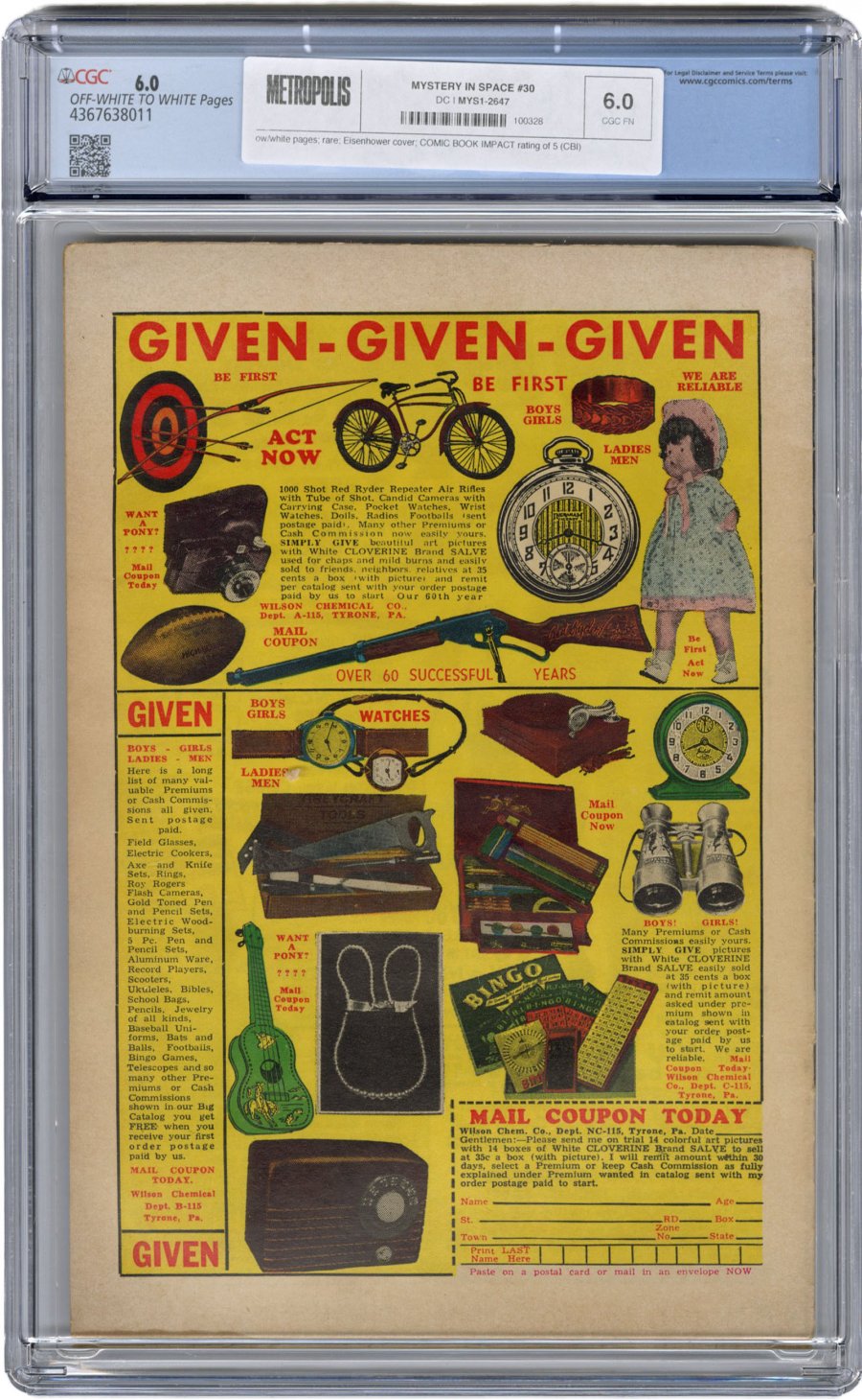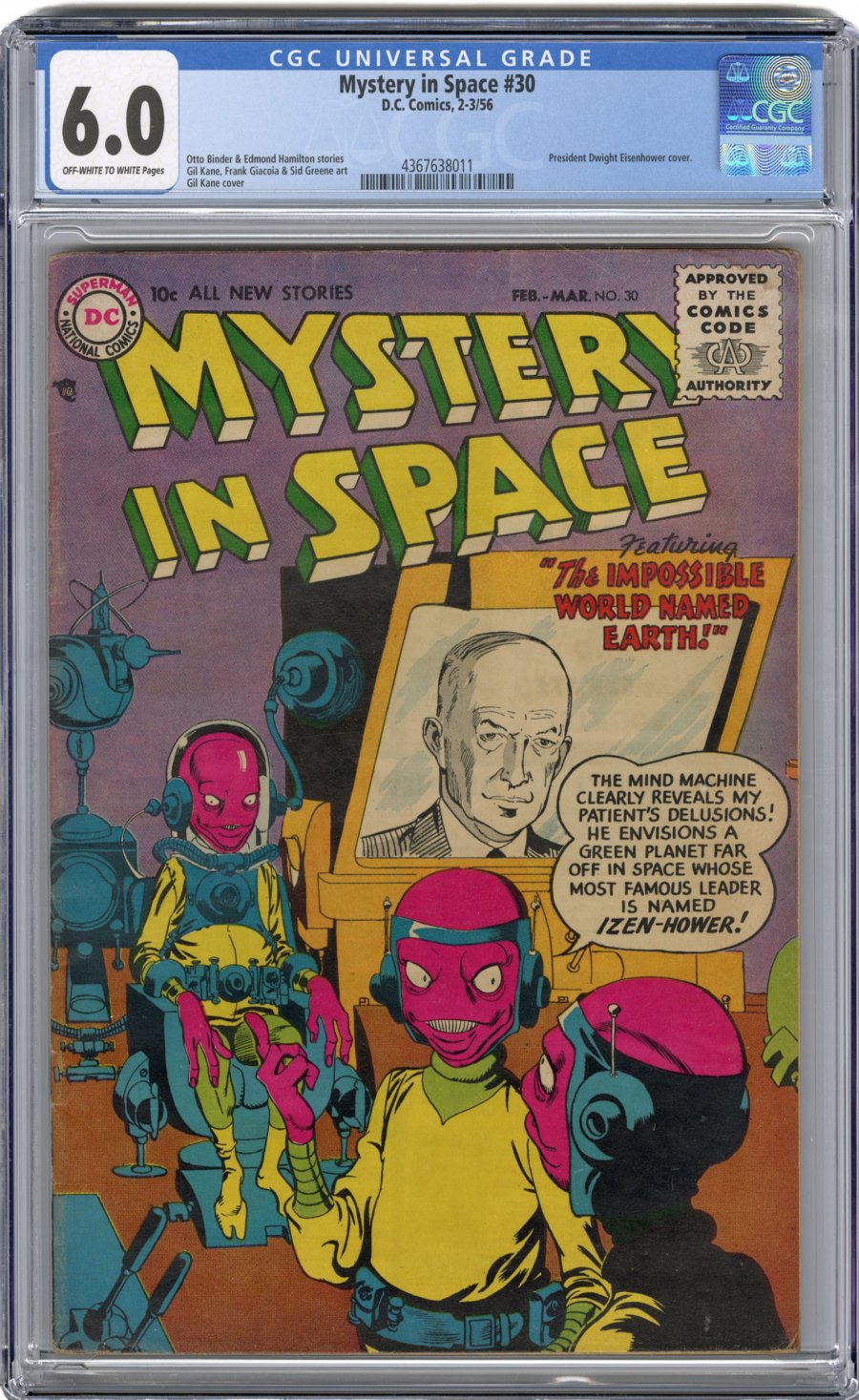 rare; Eisenhower cover; COMIC BOOK IMPACT rating of 5 (CBI)"The Impossible World Named Earth," "The Boomerang World," "The Patent Planet," and "The Robinson Crusoe of Space" (pencils by Gil Kane). Carmine Infantino pencils?