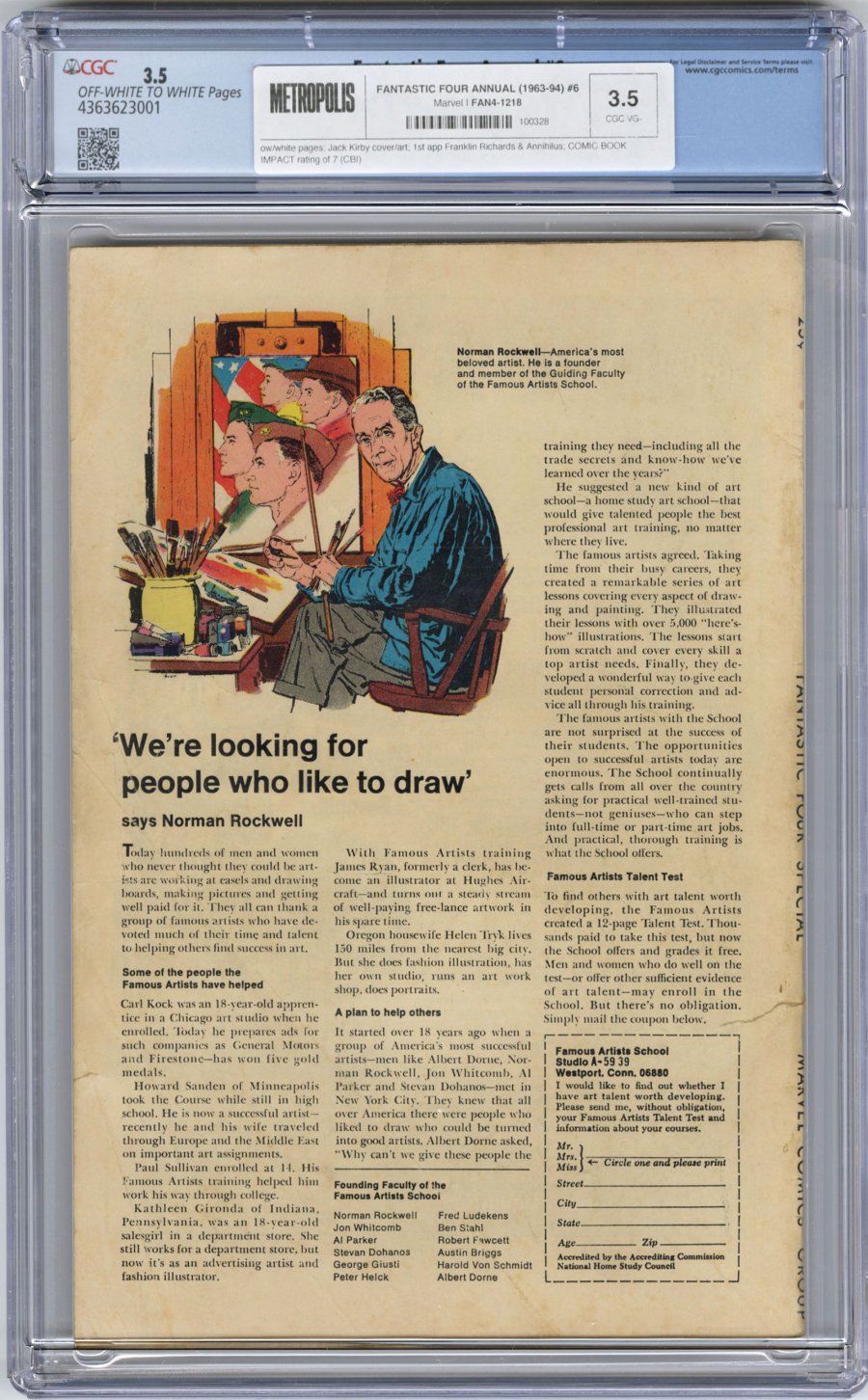 Jack Kirby cover/art; 1st app Franklin Richards & Annihilus; COMIC BOOK IMPACT rating of 7 (CBI)The Fantastic Four, dubbed Marvel’s First Family, celebrated their milestone sixth Annual special by adding one more member to their roster: Franklin Richards, the son of Reed and Sue. Ever since their wedding (Fantastic Four Annual #3) Marvel godfathers Stan Lee and Jack Kirby knew the natural next step for the two heroes would be having a child, but not before ramping up the stakes. The cosmic rays in Sue’s blood caused near fatal complications to her pregnancy, leading Reed and the rest of the team to steal the Element X from the alien conqueror Annihilus, who makes his first appearance in this issue. Originally, Stan Lee kept readers guessing whether Reed and Sue's first born would have powers and didn't even give him a name for another two years, but eventually Franklin Richards would come into his own becoming one of Marvel’s most powerful mutants. Later he would go on to become a key figure in the infamous Onslaught Saga and be featured in youth-oriented superteam titles. This sixth Annual issue would resonate with readers and fans of Marvel making them feel like part of the family that grew up with the FF as the heroes embarked in the next chapter of their lives. Aside from this comic’s sentimental value, the Negative Zone’s overlord Annihilus is also rumored to be the next “big bad” of the MCU and will assuredly place this book in high demand for investors.