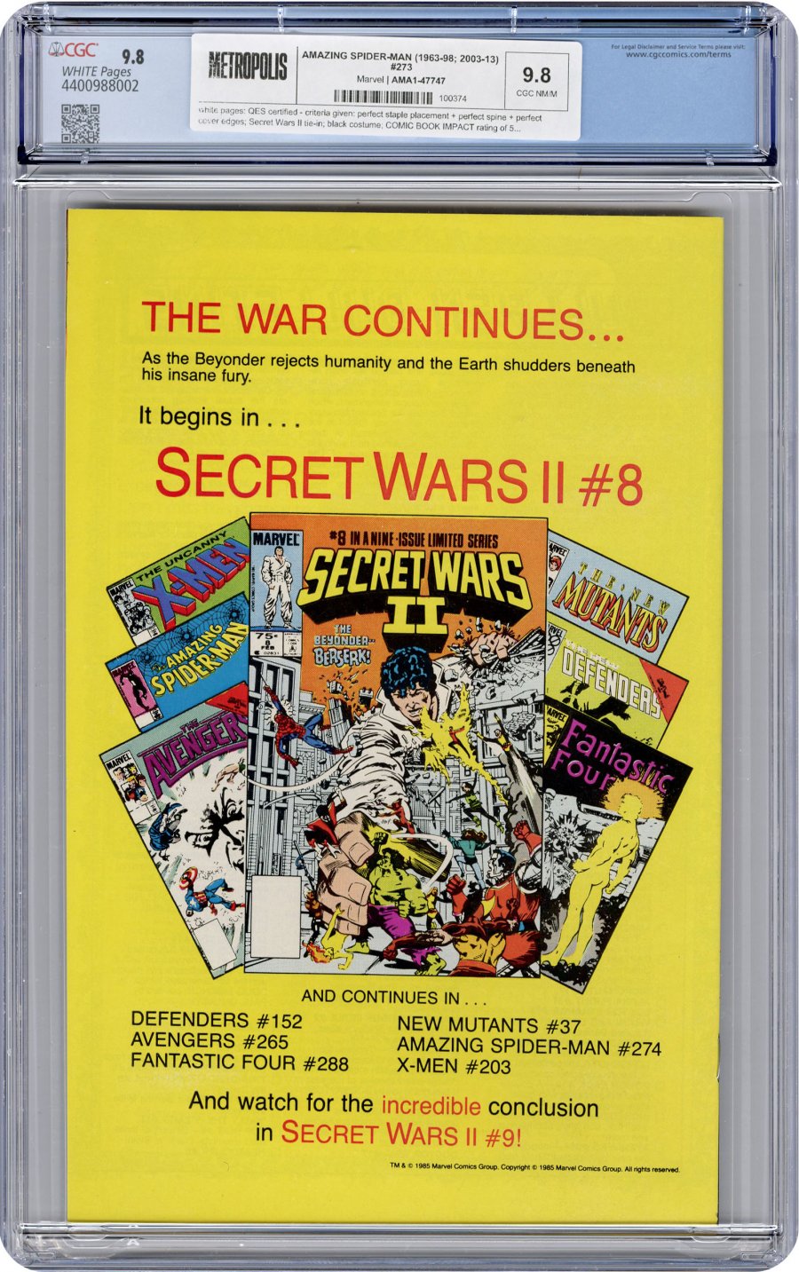 Secret Wars II tie-in; black costume; COMIC BOOK IMPACT rating of 5 (CBI)