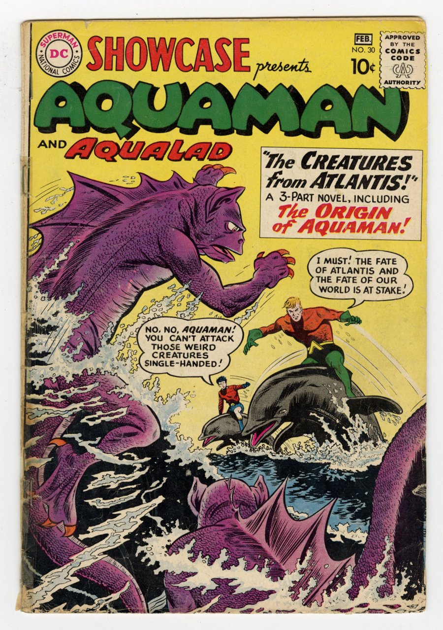 1st Silver Age Aquaman tryout issue; origin of Aquaman (1-2/61) COMIC BOOK IMPACT rating of 8 (CBI)Aquaman, once the subject of light-hearted derision, has enjoyed a renaissance due in no small part to the enormous box office success of the DCEU movie starring the man mountain Jason Momoa. Showcase #30 features the first Silver Age appearance of the King of the Seven Seas and presents Aquaman's origin story, making this issue especially appealing to his fans, both old and newly minted.