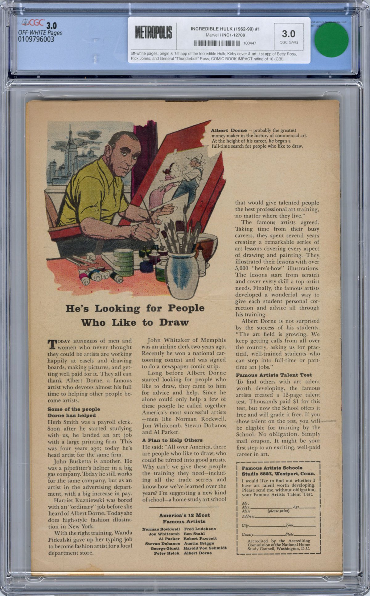 origin & 1st app of the Incredible Hulk; Jack Kirby cover & art; 1st app of Betty Ross, Rick Jones, and General "Thunderbolt" Ross; COMIC BOOK IMPACT rating of 10 (CBI)