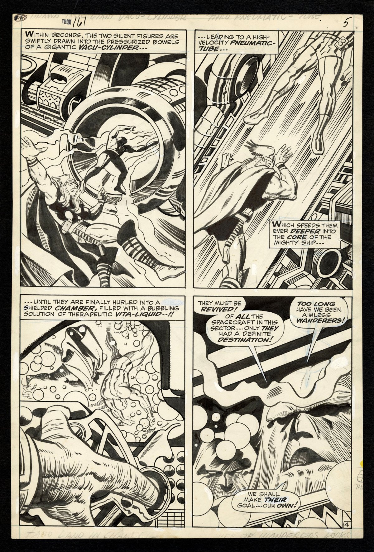 Jack Kirby pencils/Vince Colletta inks; page 4; 1969; image size 10" x 15"Thor and the Recorder, while searching for Galactus, encounter a ship run by aliens known as the Wanderers. Pen and ink. Art is in excellent condition.