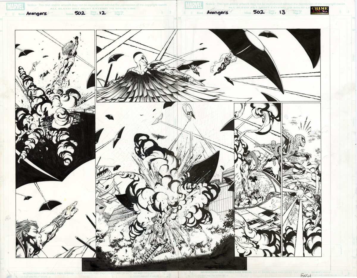 David Finch pencils/Danny Miki inks; pages 12-13; 2004; image size 19" x 15"Pen and ink. Art is in excellent condition. Signed by Finch.