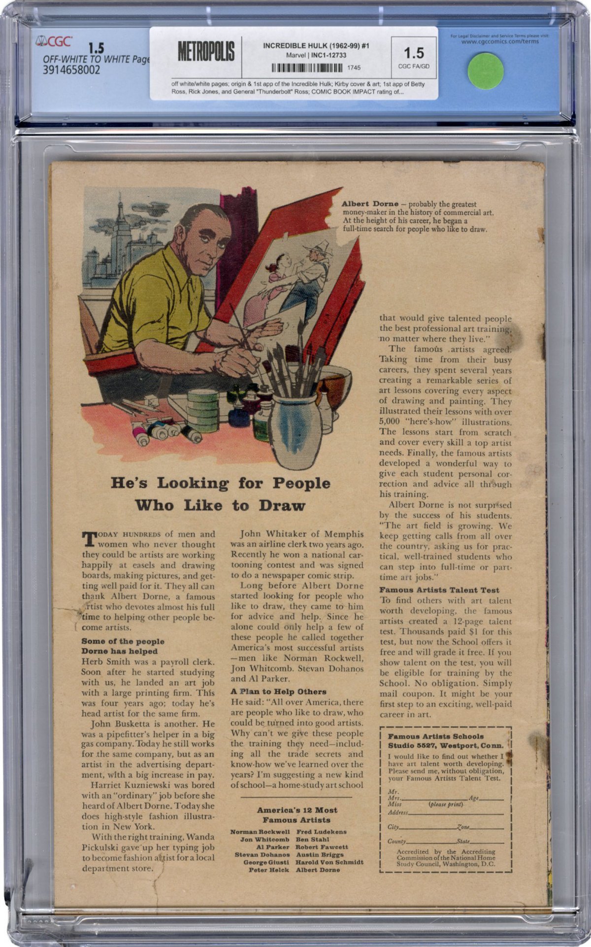 origin & 1st app of the Incredible Hulk; Jack Kirby cover & art; 1st app of Betty Ross, Rick Jones, and General "Thunderbolt" Ross; COMIC BOOK IMPACT rating of 10 (CBI)