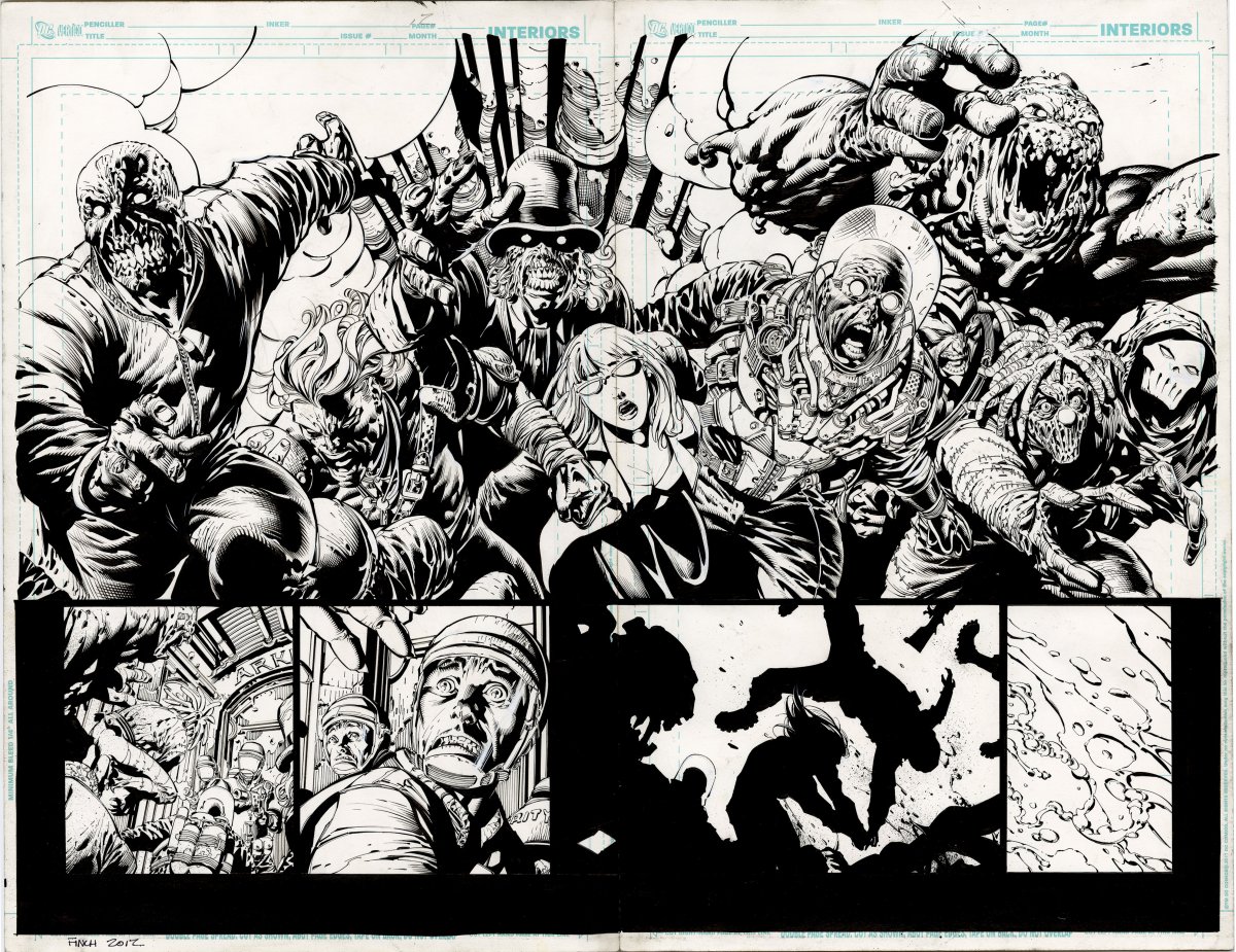 David Finch pencils/Richard Friend inks; pages 12-13; 2011; image size 21.5" x 16"Pen and ink. Art is in excellent condition. Signed and dated by Finch in the lower margin.