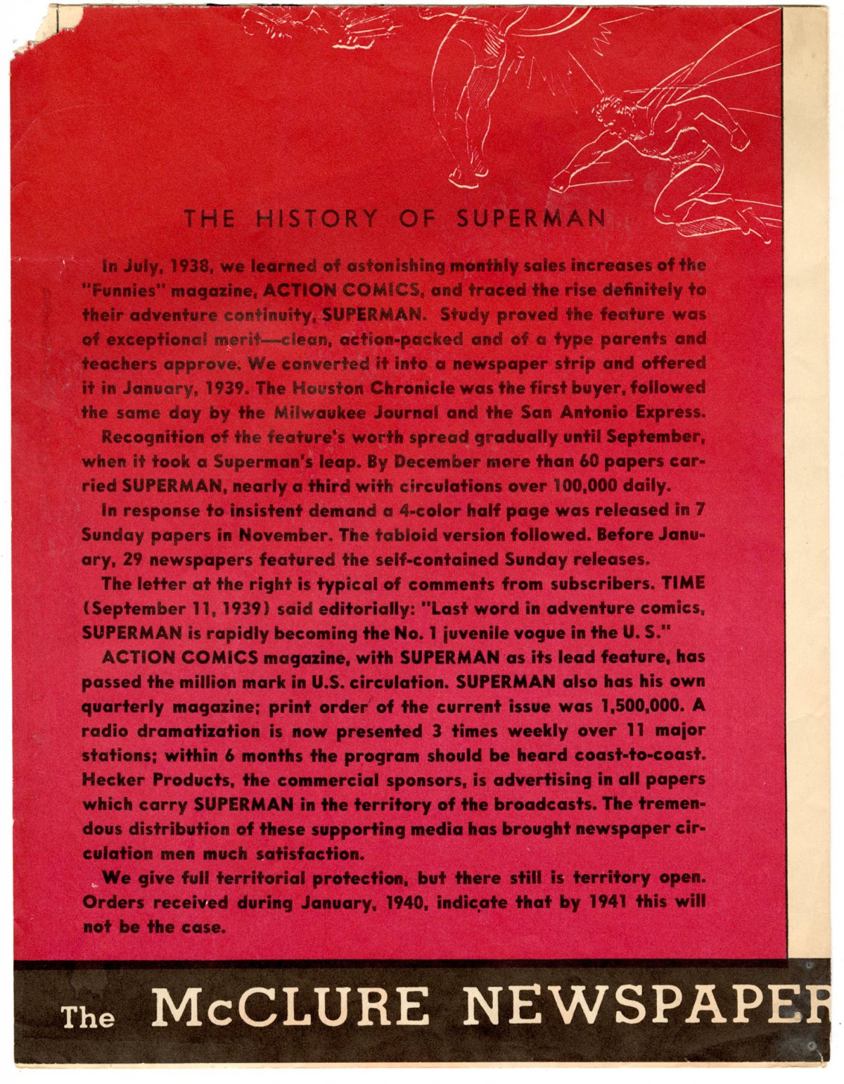 COMMENTS: 1940 17"x22" promo poster to license the Superman strip to potential newspapers. Joe Shuster art! Rare!! chipping at one corner
