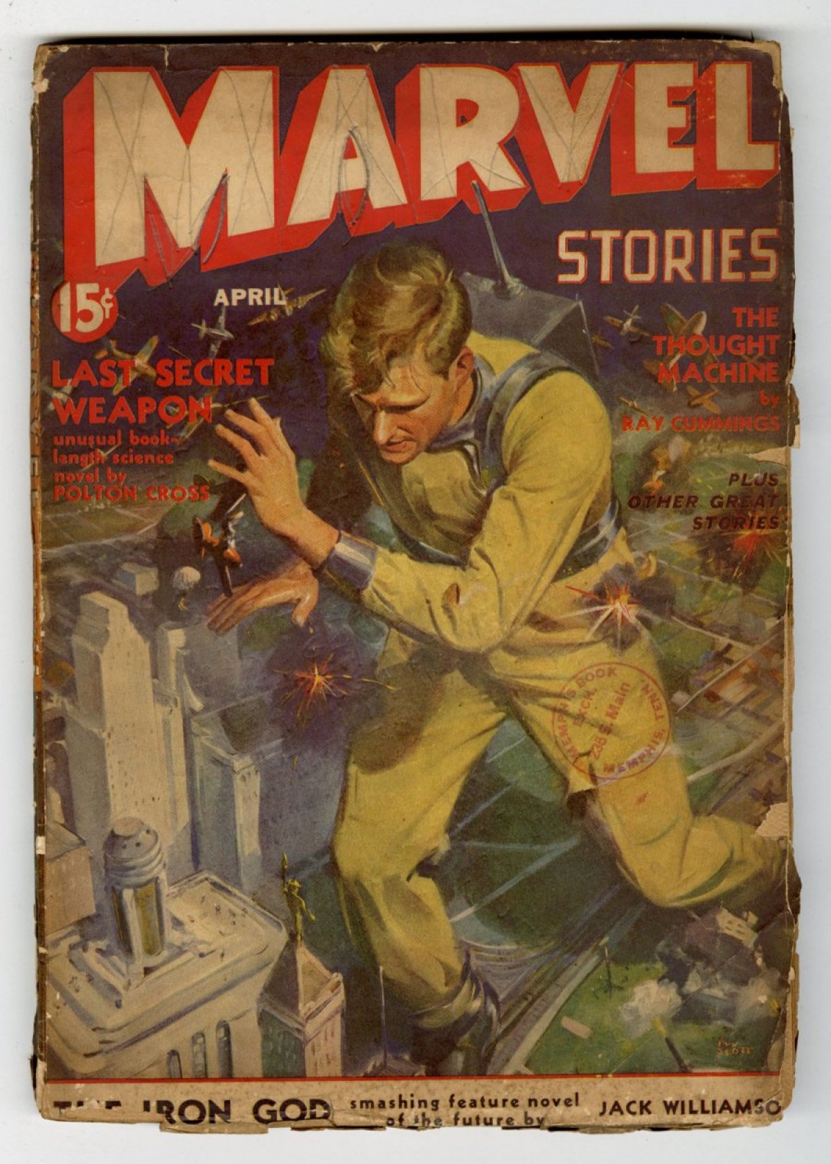 V2 #3 (April 1941); Giant soldier attacks city cover; "The Last Secret Weapon" by Polton Cross (John Russell Fearn); "Girl from Venus" by D. D. Sharp; "The Iron God" by Jack Williamson