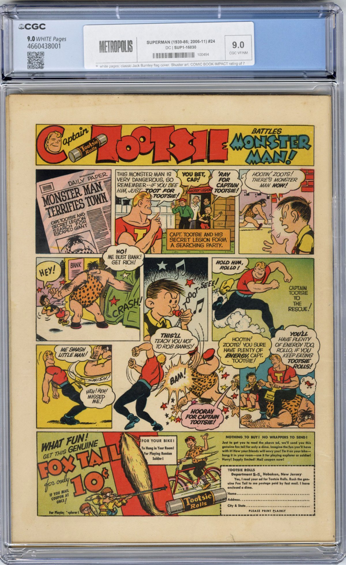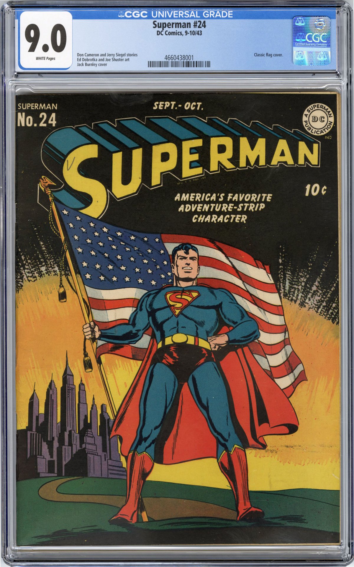 Superman #24 offers another classic cover from Jack Burnley, featuring the Man of Steel posing before an unfurled flag. The patriotic fervor is timeless, but this issue also serves as a cultural curio with the cover's use of the term "adventure strip," which would soon be abandoned after the end of WWII. In this case, however, the book boasts the classic adventure of "Perils of Poor Lois," in which Superman uses his super-imagination to do some serious daydreaming about a regular life with Lois Lane. That story includes the first appearance of Lois Lane's father, although this Sam Lane is too much of a fantasy to be canon.
