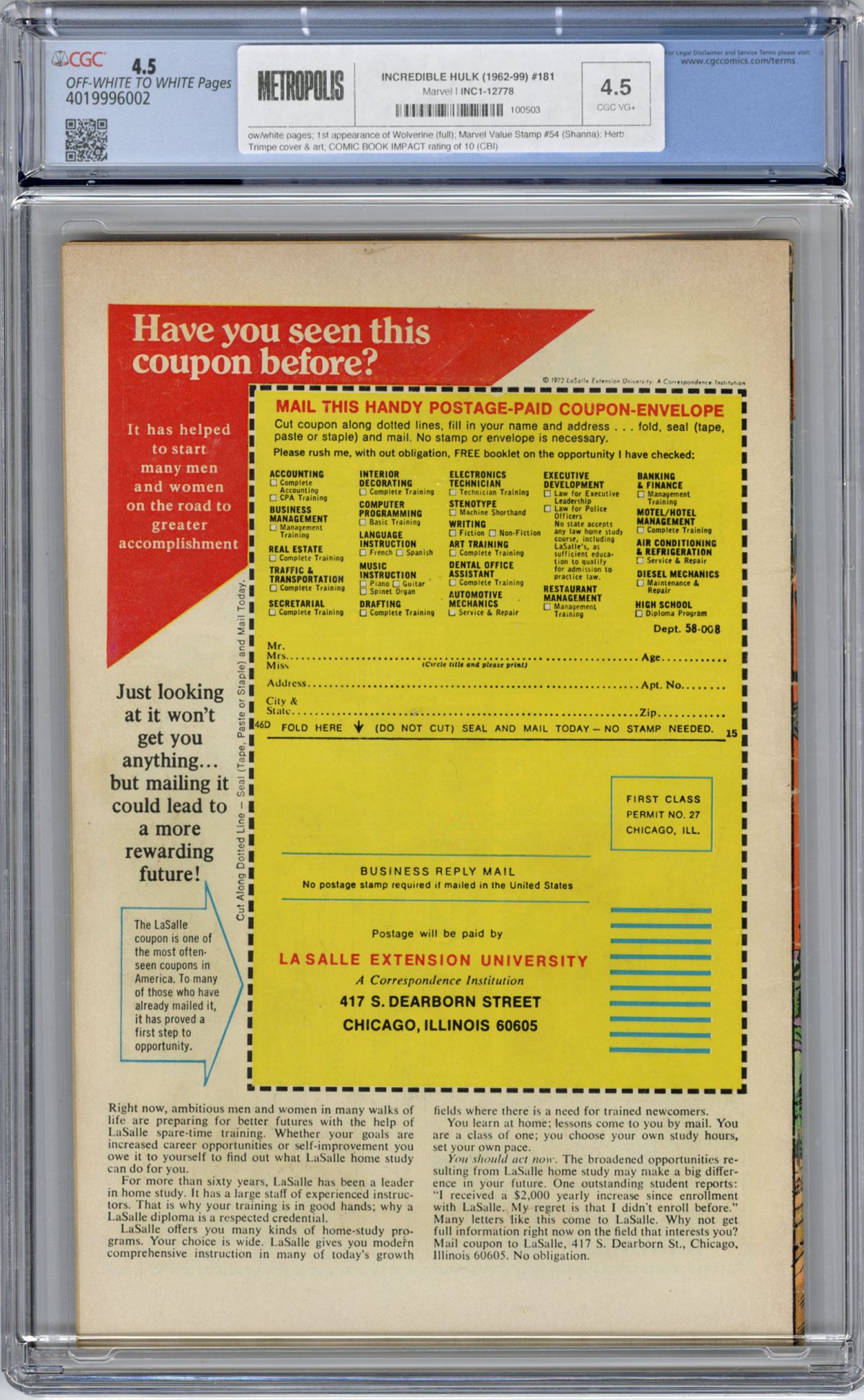 Incredible Hulk #181 became the first Bronze Age book to break the $100,000 sales mark.