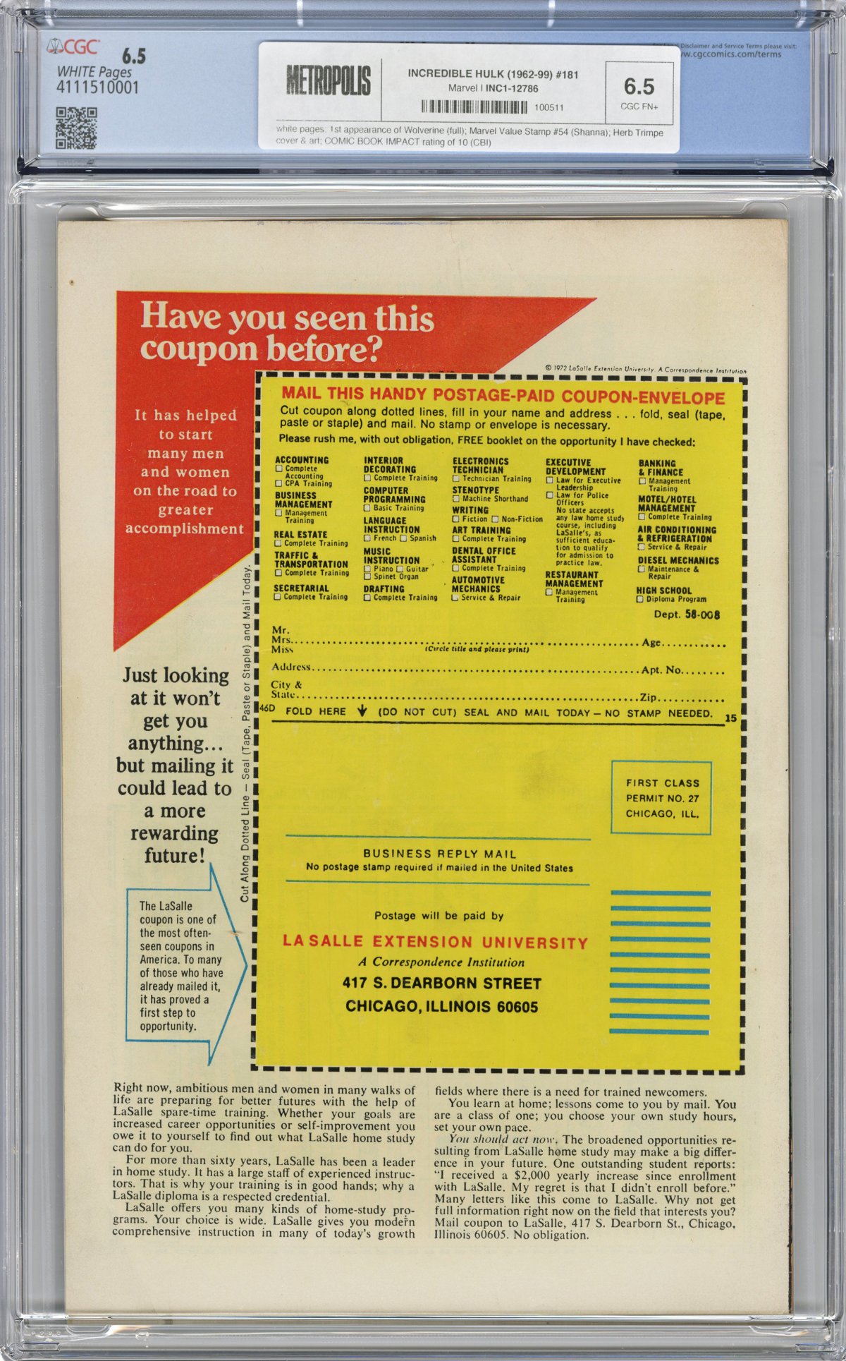 Incredible Hulk #181 became the first Bronze Age book to break the $100,000 sales mark.