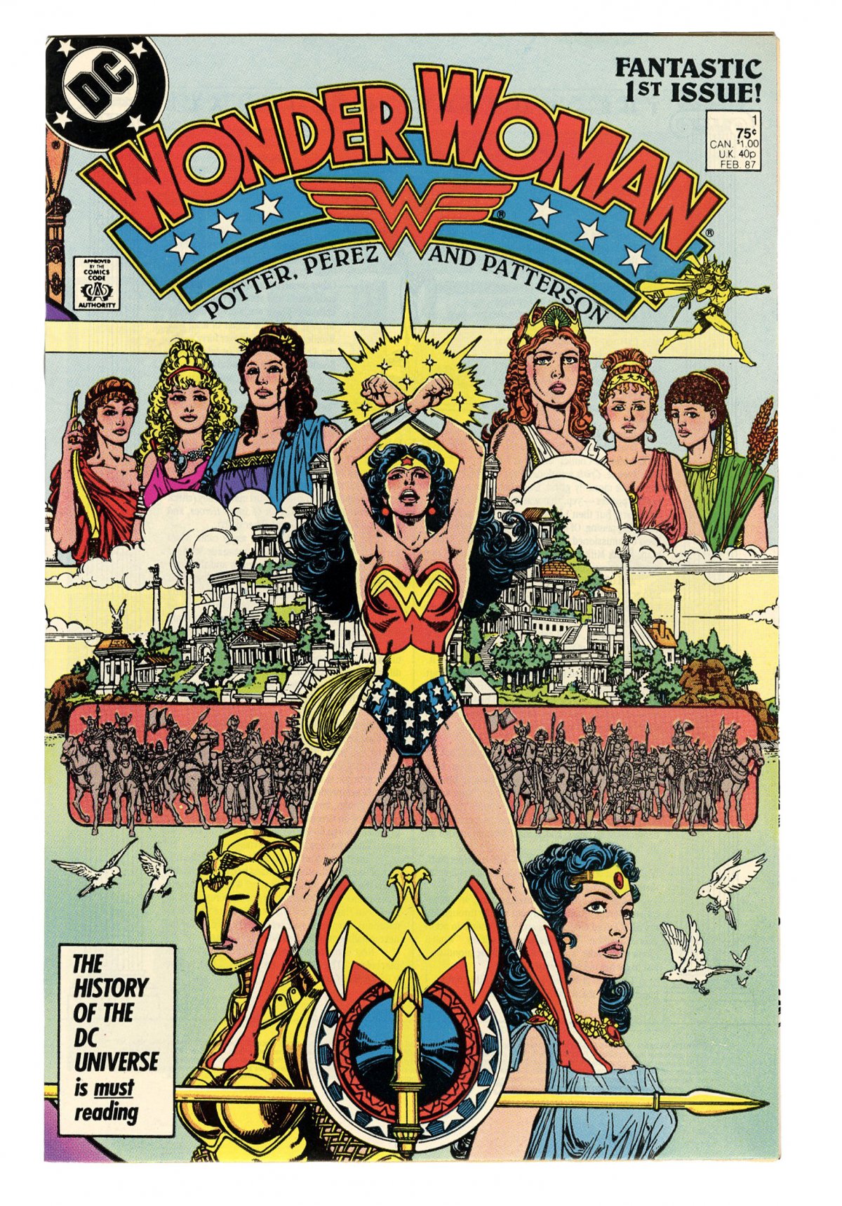 George Perez wraparound cvr/art; blockbuster Wonder Woman movies! COMIC BOOK IMPACT rating of 7 (CBI)1st modern app. of Themyscira, Gaea's Girdle, Hippolyte, Ares & the Olympian Gods, new origin