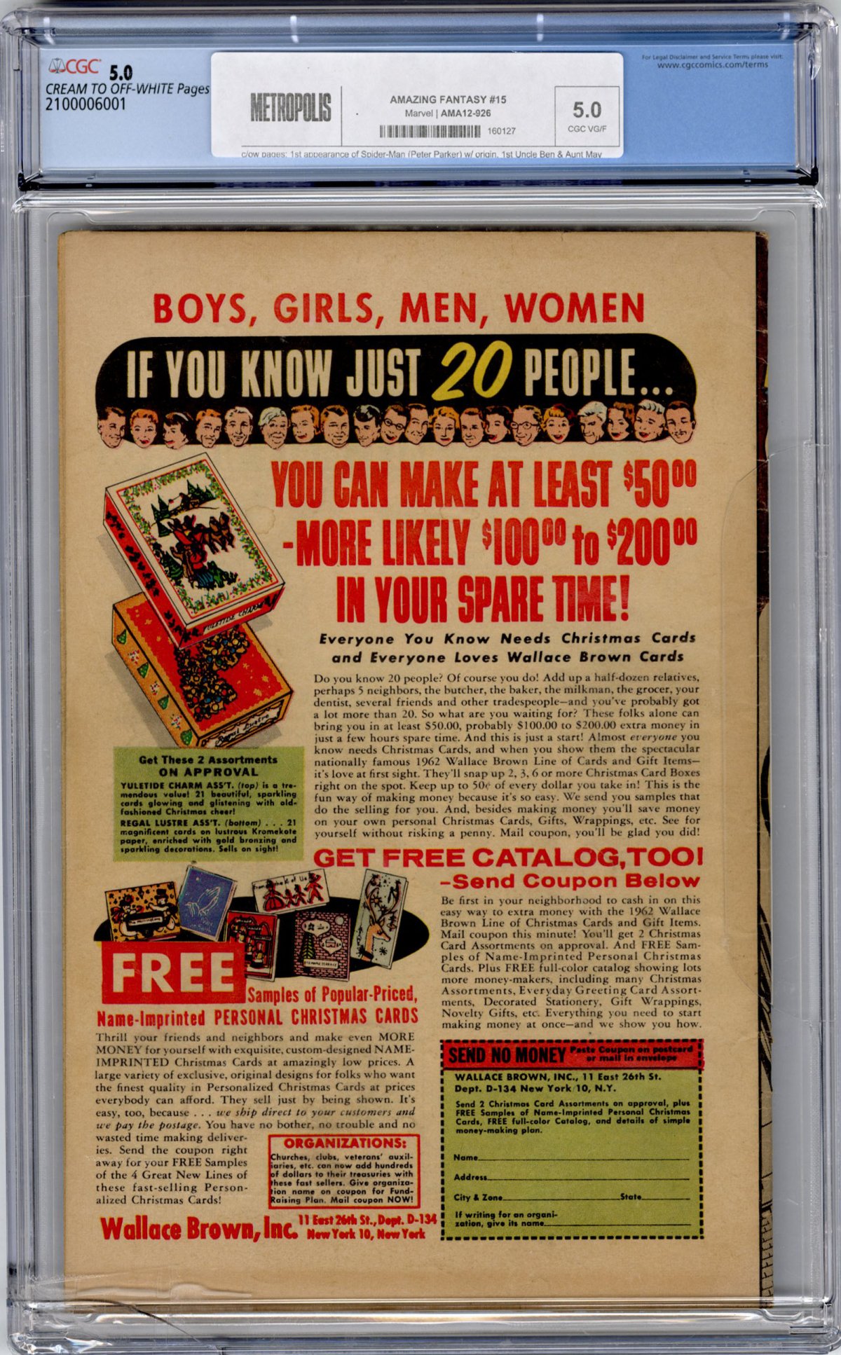 1st appearance of Spider-Man (Peter Parker) w/ origin, 1st Uncle Ben & Aunt May (8/62); Jack Kirby cover, Steve Ditko art; COMIC BOOK IMPACT rating of 10 (CBI)