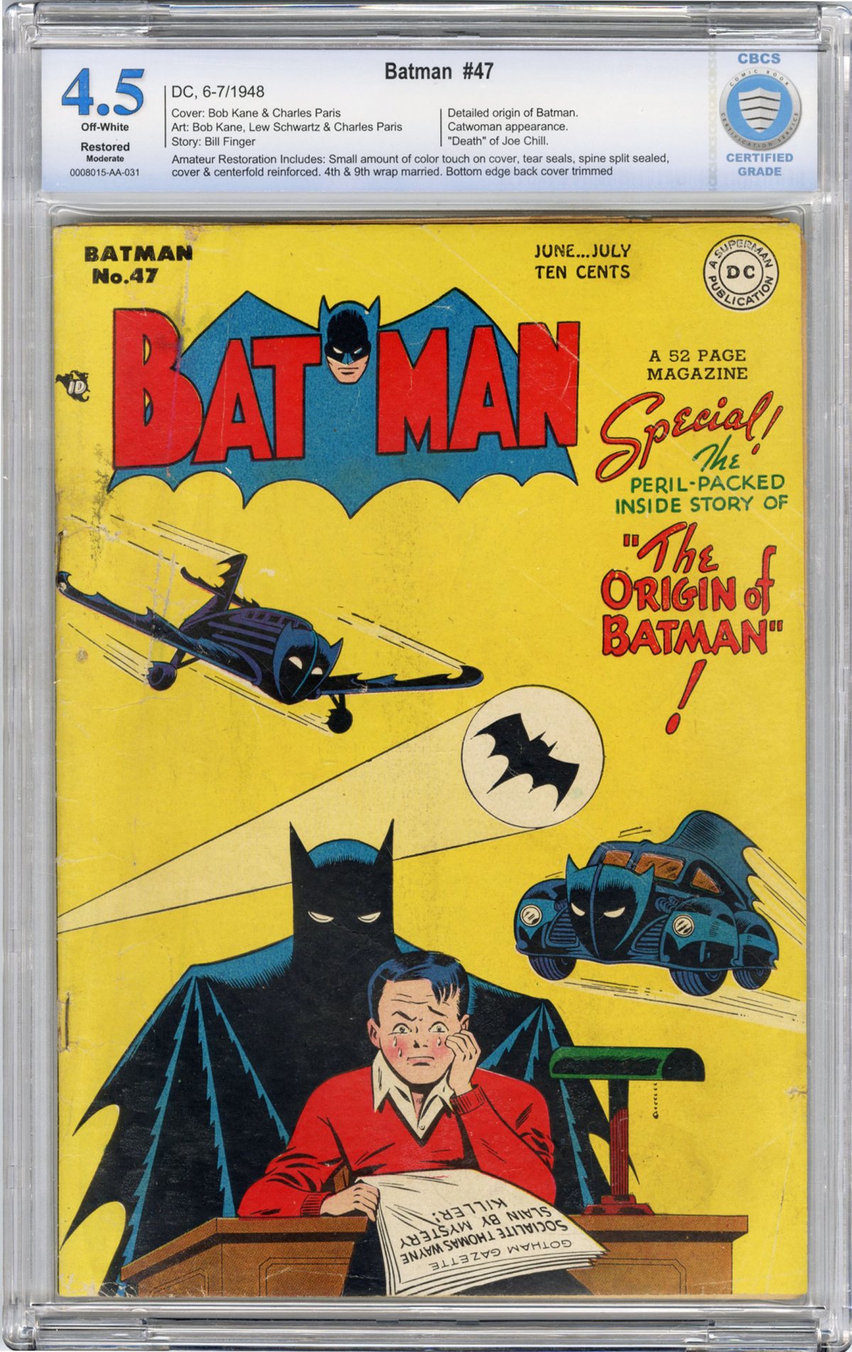 Just as Superman's origin was gussied up for the new, post-WWII era of heroic action, so too did DC add drama and color to the Batman's already iconic origin tale. Previously, all that was known of the Caped Crusader's beginnings came from the crude but affecting one-page debut tale in seen in Batman #1, leaving the door wide open for Batman co-creator Bill Finger to expand upon the hero's dark origins and spin a new tale of revenge. Re-encountering Joe Chill, the boxer-faced thug who murdered his parents, the Dark Knight reveals his secret Bruce Wayne identity to the aging gunman in a startling and still-effective scene that is rightly legendary, and proves that maligned Bat-Daddy Bob Kane could still turn out surprisingly solid work given the right impetus. An instant classic, capped with a cover as revered as any from the first year of Bat-appearances in Detective, this is a major, badly underappreciated key, made even more collectible due to the lower print runs of post-WWII comics and the surprisingly low number of surviving copies in acceptable condition. One of the most important comics published in the late Golden Age, and one of the top five Bat-keys of all time.