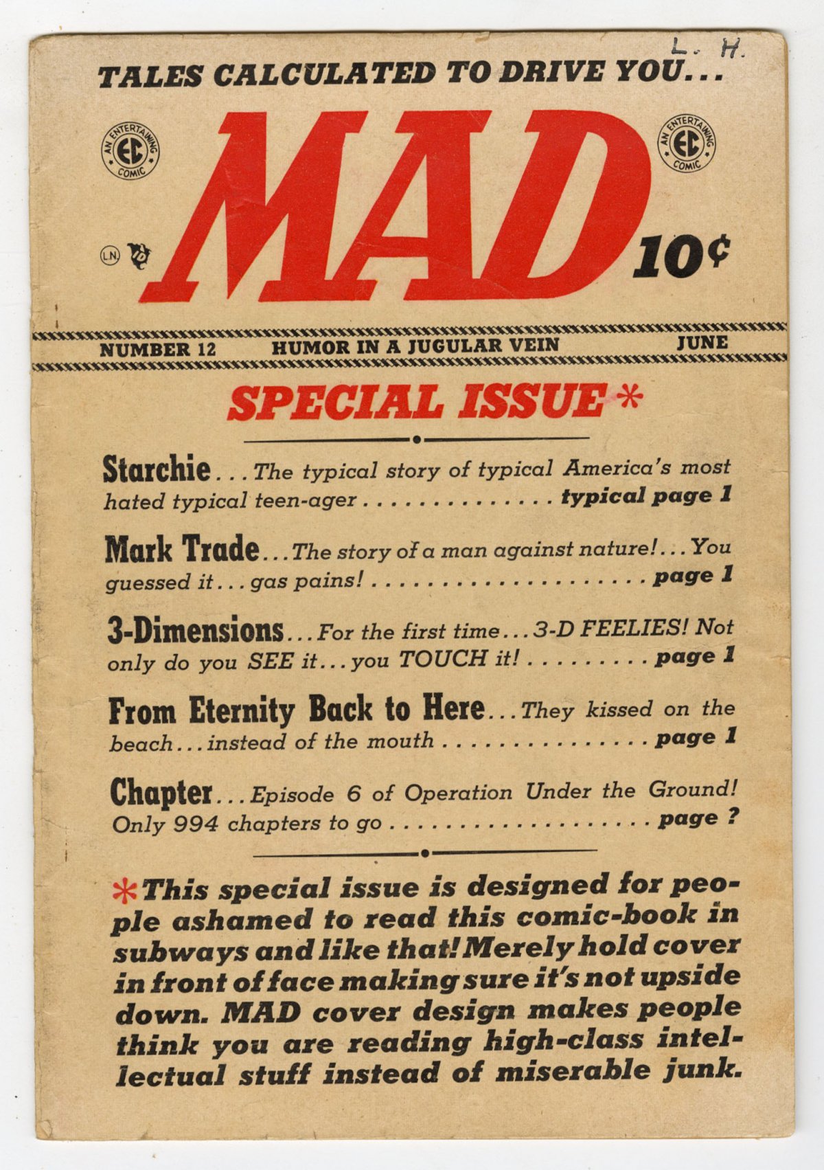 Archie "From Here to Eternity" parodies; 3-D comic spoof; nudity panels; COMIC BOOK IMPACT rating of 6 (CBI)MAD was known for their clever novelty covers, from this early example, designed to look like Reader’s Digest or some other milquetoast 50’s publication, the staff at MAD couldn’t contain their satire to the interior of the book for long. The early comedic cover illustrations quickly gave way to a variety of experimental covers, from copying the look of a school notebook to the infamous fold in back covers, responsible for many surviving issues being in lower grades, MAD was forever stretching the limitations of what could be done with comics, and later, magazines. But this is one of the earliest incidences of using the format of comics as a form of parody, lampooning the look of a “normal” periodical of the era. The trend would culminate with the inclusion of Alfred E. Neuman taking part in every cover for decades, appearing in everything from 60s psychedelia to 80s sci-fi films. This book is another of the important early issues that signaled the staying power MAD would have once the book hit its stride. Targets in this issue include Archie, 3-D comics, “From Here to Eternity,” and much more.