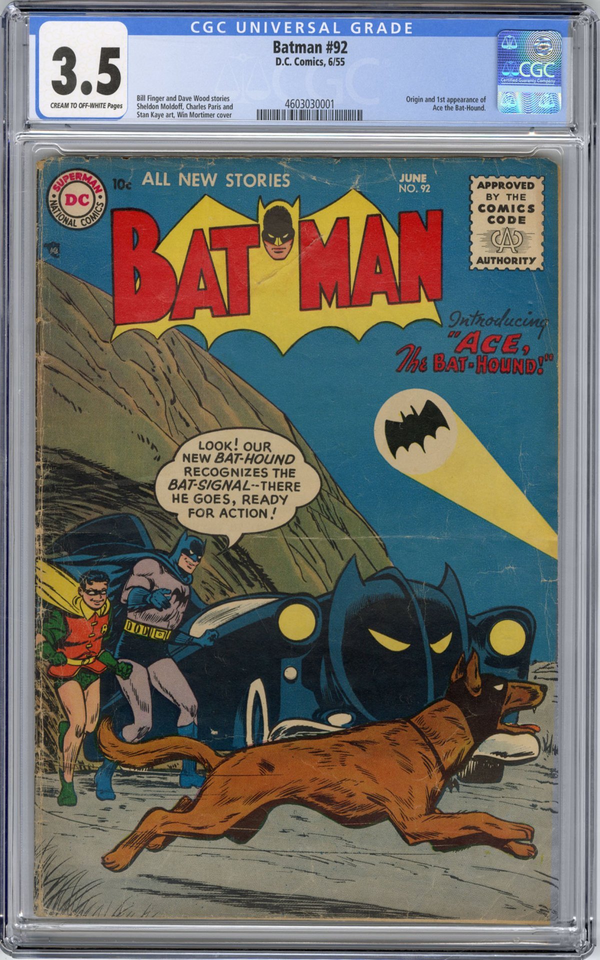 Win Mortimer cover; Sheldon Moldoff pencils; 1st app/Origin of Ace the Bat-Hound; COMIC BOOK IMPACT rating of 7 (CBI)Cover by Win Mortimer. "Fan-Mail of Danger!" script by Bill Finger, pencils by Sheldon Moldoff, inks by Charles Paris; Swamped by fan mail, Batman hires a secretary to handle all of it, who, unwittingly, causes the volume of mail to increase, thus hampering the Caped Crusader's war on crime; A threat from a forger, who has obtained an example of Batman's signature and who attempts to uncover Batman's true identity from it, has to be stopped in his tracks. 2/3-page Casey the Cop story by Henry Boltinoff. "Batman's Guilty Neighbor!" script by Dave Wood, pencils by Sheldon Moldoff, inks by Charles Paris; Bruce's new neighbor, Cal Tremont, is suspected in a series of crimes and it's up to the Caped Crusader to track down the guilty party and clear Cal's name. 2-page Casey the Cop story by Henry Boltinoff. College for Camera Cops article by Jack Miller. -page Shorty story by Henry Boltinoff. First appearance of Ace, the Bat-Hound in "Ace, the Bat-Hound!", script by Bill Finger, pencils by Sheldon Moldoff, inks by Stan Kaye; When Batman and Robin find an injured dog they they take it back to the Batcave; The dog helps them with a few cases and leads them to the crooks who kidnapped his master.
