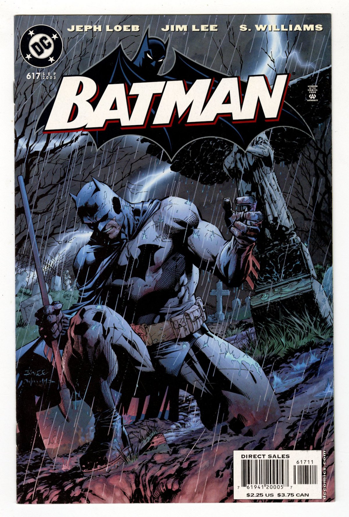 return of Jason Todd (cameo) Jim Lee cover/art; COMIC BOOK IMPACT rating of 6 (CBI)WRITTEN BY JEPH LOEB; ART AND COVER BY JIM LEE AND SCOTT WILLIAMS. With just three issues to go, the mystery of "Hush" deepens! For months, the relationship between Batman and Catwoman has been heating up. Everyone seems happy about it, except for Robin, the Boy Wonder! Robin's got some issues with Catwoman and the secrets she knows. Does Batman's young partner have the stuff to take out Catwoman? Or will the Cat swallow the little bird? It all leads up to Batman making the most startling discovery of all...and here's a hint: The story is titled "The Grave!" For more information, see the feature article.