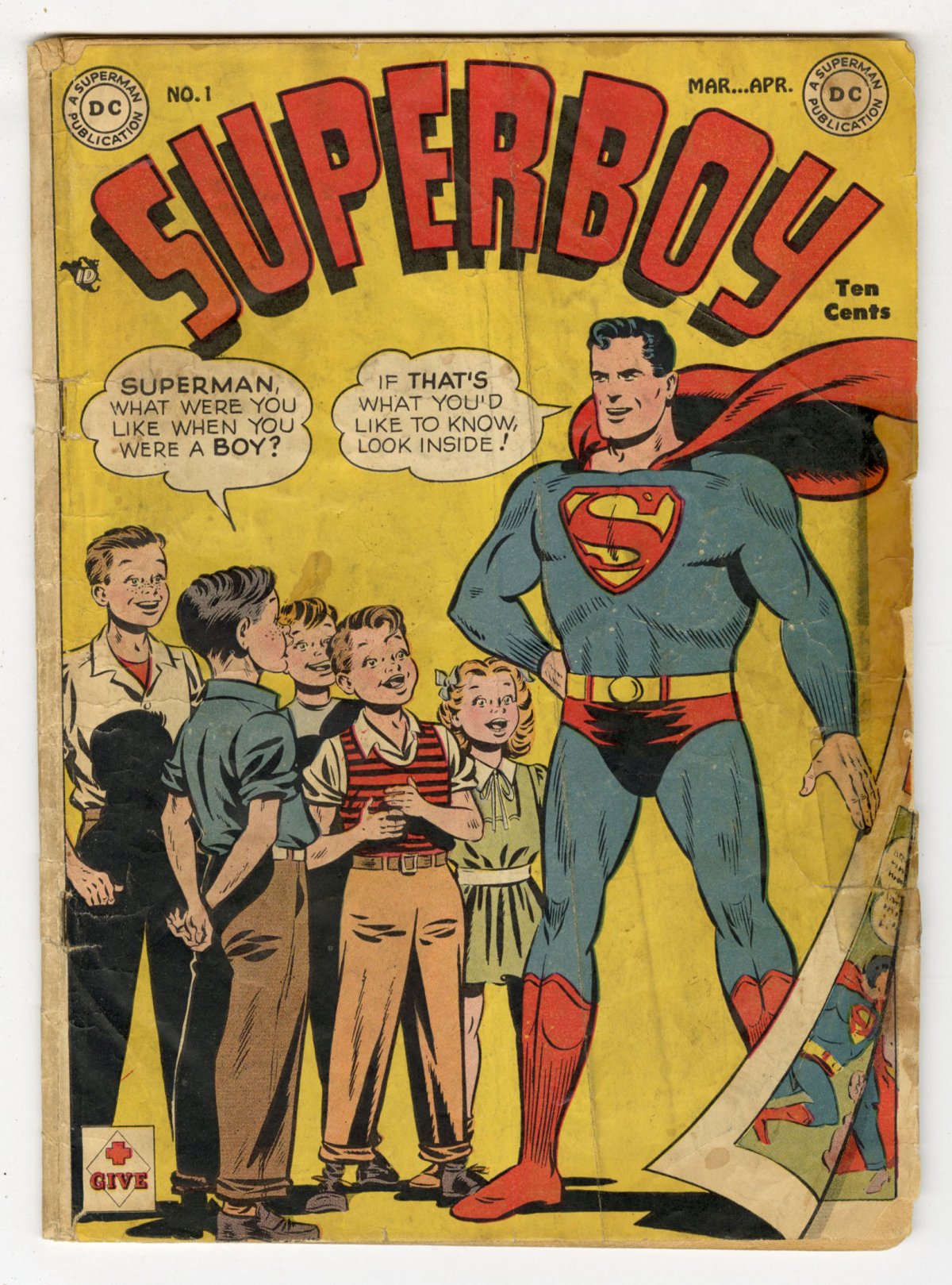 Wayne Boring Superman cover; COMIC BOOK IMPACT rating of 7 (CBI)On the cover of this classic a young fan asks Superman "What were you like when you were a boy?" One can imagine the writers at DC asking themselves that very same question, and, lo and behold, a new title, character, and concept were born. Starting a trend of exploring the youthful days of several of their big-name heroes which would culminate with the original Teen Titans, this book was the spark that lit the fire which would find DC mining a younger, more-innocent demographic that could be weaned on tamer tales of adventure and slowly evolve into full-fledged adult comic book fans.