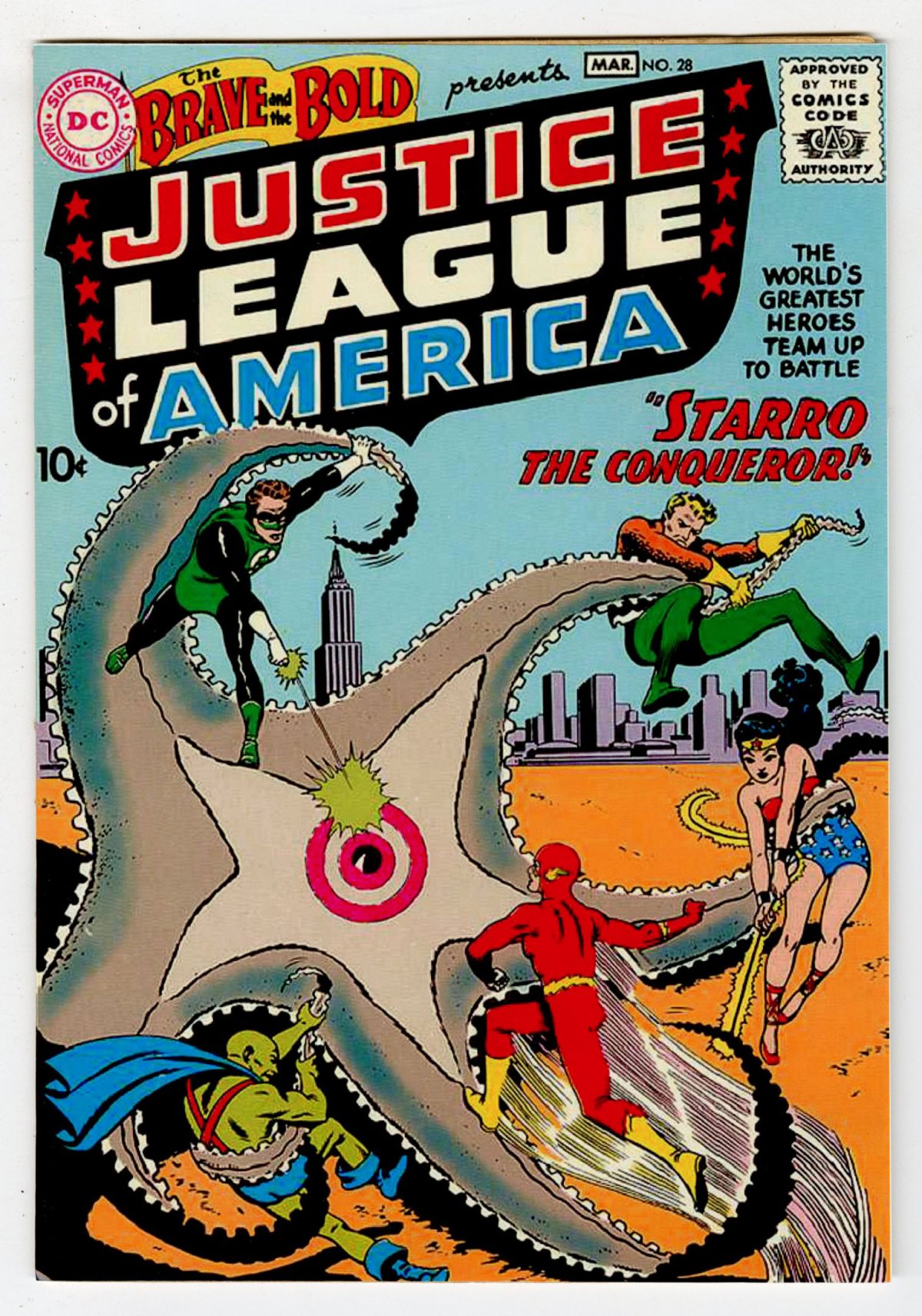 The Brave and the Bold. "Starro the Conqueror" was an instant classic comic, introducing both the JLA and the intergalactic starfish who'd become one of DC's favorite villains. The story was also a comeback for Aquaman and the Martian Manhunter, who both finally made their first U.S. cover appearances here. (There's also the first appearance of Snapper Carr as the hipster sidekick who was common in pop culture after Edd Byrnes' success as "Kookie" in the hit TV series
