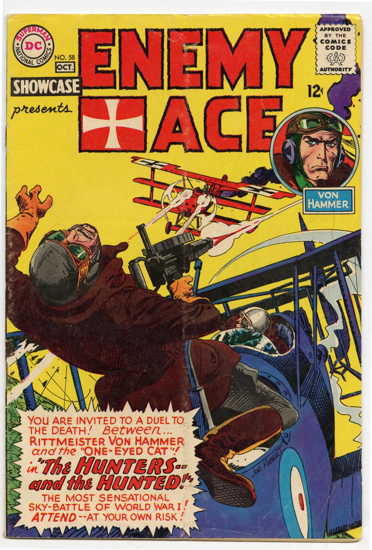 Enemy Ace by Kubert (5th app.)5th appearance of Enemy Ace. Cover art by Joe Kubert. The Hunters -- and the Hunted! starring Enemy Ace, script by Robert Kanigher, art by Joe Kubert; Enemy Ace faces off against the French pilot named "The One-Eyed Cat." Enemy Ace continues in Star Spangled War #138.