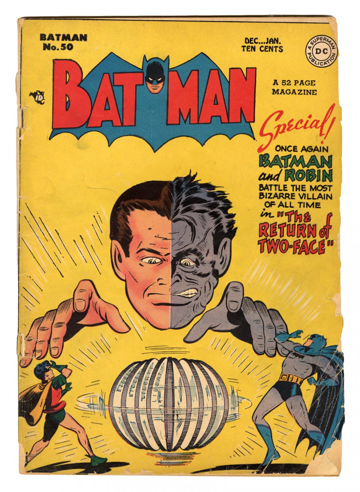 Two-Face cover; Joker app; COMIC BOOK IMPACT rating of 7 (CBI)Cover pencils by Bob Kane, inks by Charles Paris. Lights--Camera--Crime!, pencils by Bob Kane (Batman & Robin figures only) and Lew Sayre Schwartz, inks by Charles Paris; Batman and Robin battle the Joker. The Return of Two-Face!, script by Bill Finger, pencils by Bob Kane (Batman & Robin figures only) and Lew Sayre Schwartz, inks by Charles Paris; After recovering from plastic surgery and reforming, Harvey Dent is tormented by dreams that he might become Two-Face again; Dent's butler, Wilkins, uses makeup to commit crimes as Two-Face and to frame Dent; Batman and Robin must stop the impostor. Tiger Teeth and Turkeys text article. The Second Boy Wonder!, pencils by Bob Kane (Batman and Robin figures only) and Lew Sayre Schwartz, inks by Charles Paris; Batman and Robin battle the Joker and a new villain called Gloves.