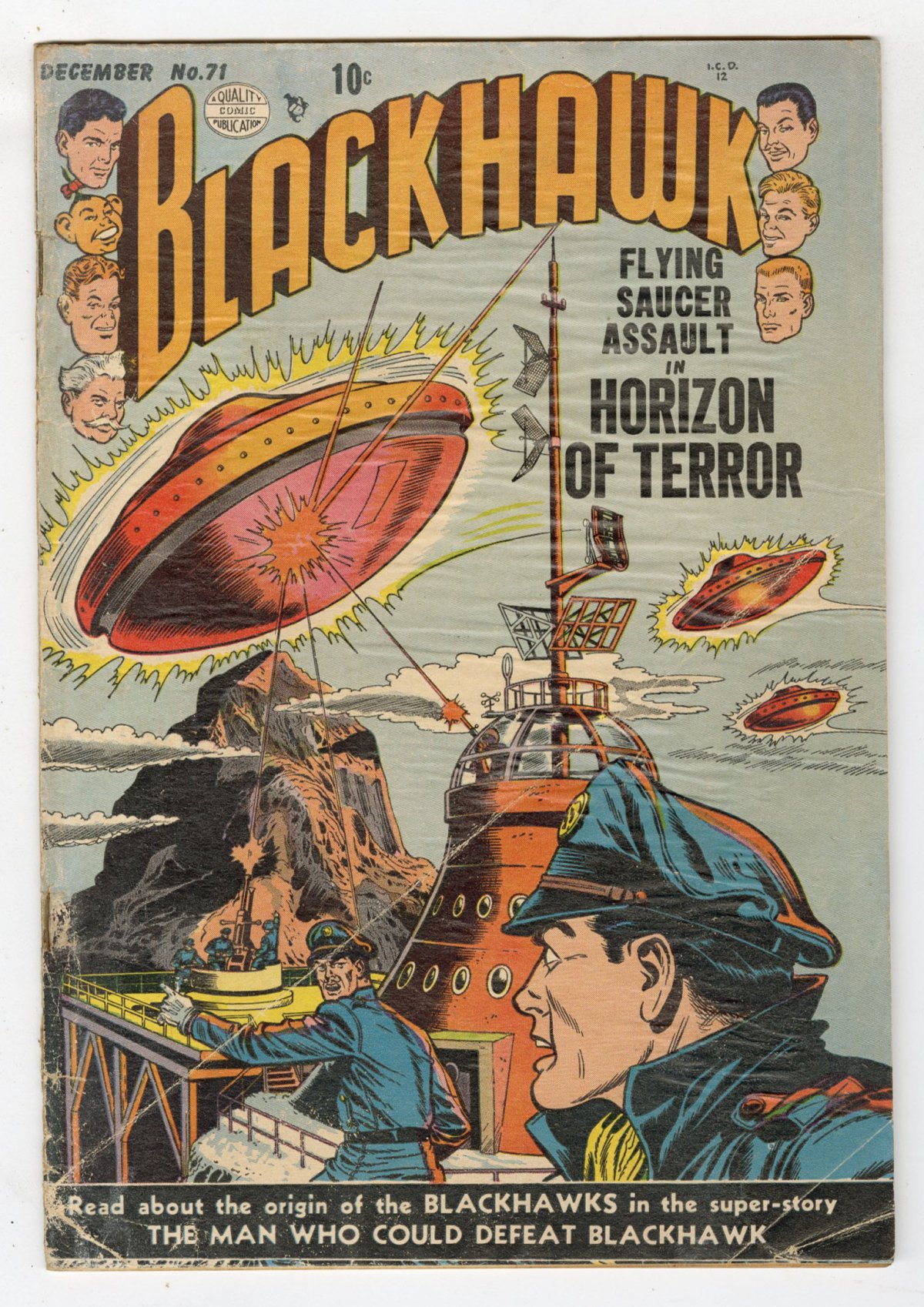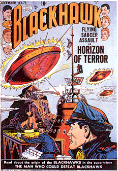 flying saucer cover; origin retold; atom bomb panels; COMIC BOOK IMPACT rating of 5 (CBI)