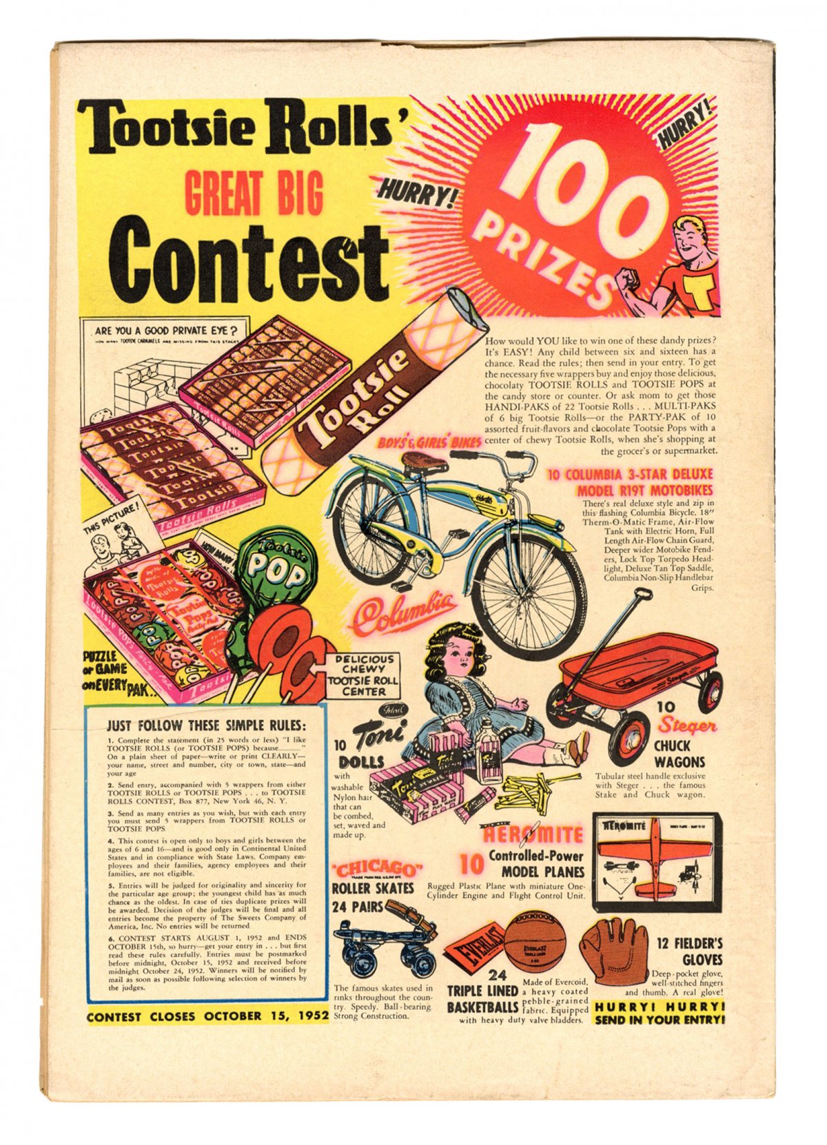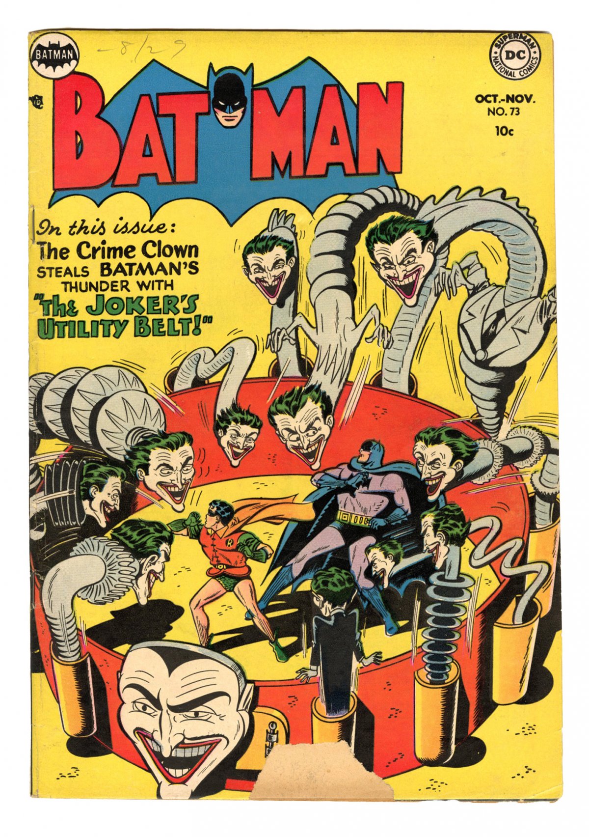 classic Dick Sprang Joker cover; COMIC BOOK IMPACT rating of 7 (CBI)Cover pencils by Dick Sprang, inks by Charles Paris. What Do You Know about Other People? public service announcement with Binky, script by Schiff, art by Mortimer. "Guns For Hire!" pencils by Sprang, inks by Paris; Gotham City criminals have developed a new method of committing crimes with rented firearms; Batman and Robin start investigating the case without success until Bruce disguises himself as a criminal. "Vicki Vale's Secret!" script by David Vern, pencils by Bob Kane (Batman and Robin figures only) and Lew Sayre Schwartz, inks by Charles Paris; Vicki Vale goes to Wayne Manor, desperately looking for help; She explains that she has brought doom upon herself, but passes out before saying anything else; Bruce and Dick leave her with Alfred while they investigate at Vicki's house as Batman and Robin. "The Joker's Utility Belt!"