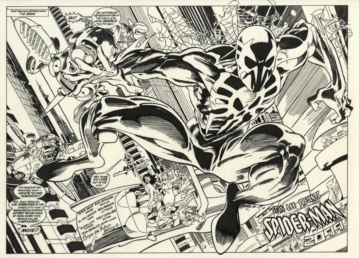 Angelo La Rosa pencils and inks; page 2-3 recreation; 2025; image size 16" x 12"Beautiful recreation of Rick Leonardi and Al Williamson's original double title spread from the 1st issue of Spider-Man 2099. Pen and ink. Art is in excellent condition.