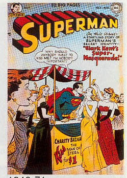 Win Mortimer cheesecake cover, Boring art; Luthor app; COMIC BOOK IMPACT rating of 6 (CBI)Clark Kent's Super-Masquerade starring R24, script by Bill Finger, pencils by Wayne Boring, inks by Stan Kaye; Superman gains temporary amnesia. The Anti-Superman Club, script by Edmond Hamilton; Superman builds a Superwoman robot. Jerry Jitterbug humor two-pager by Henry Boltinoff. Minus Three Ninety text story. The Man Who Stole the Oceans starring Superman and Lex Luthor, script by Edmond Hamilton, pencils by Wayne Boring, inks by Stan Kaye.