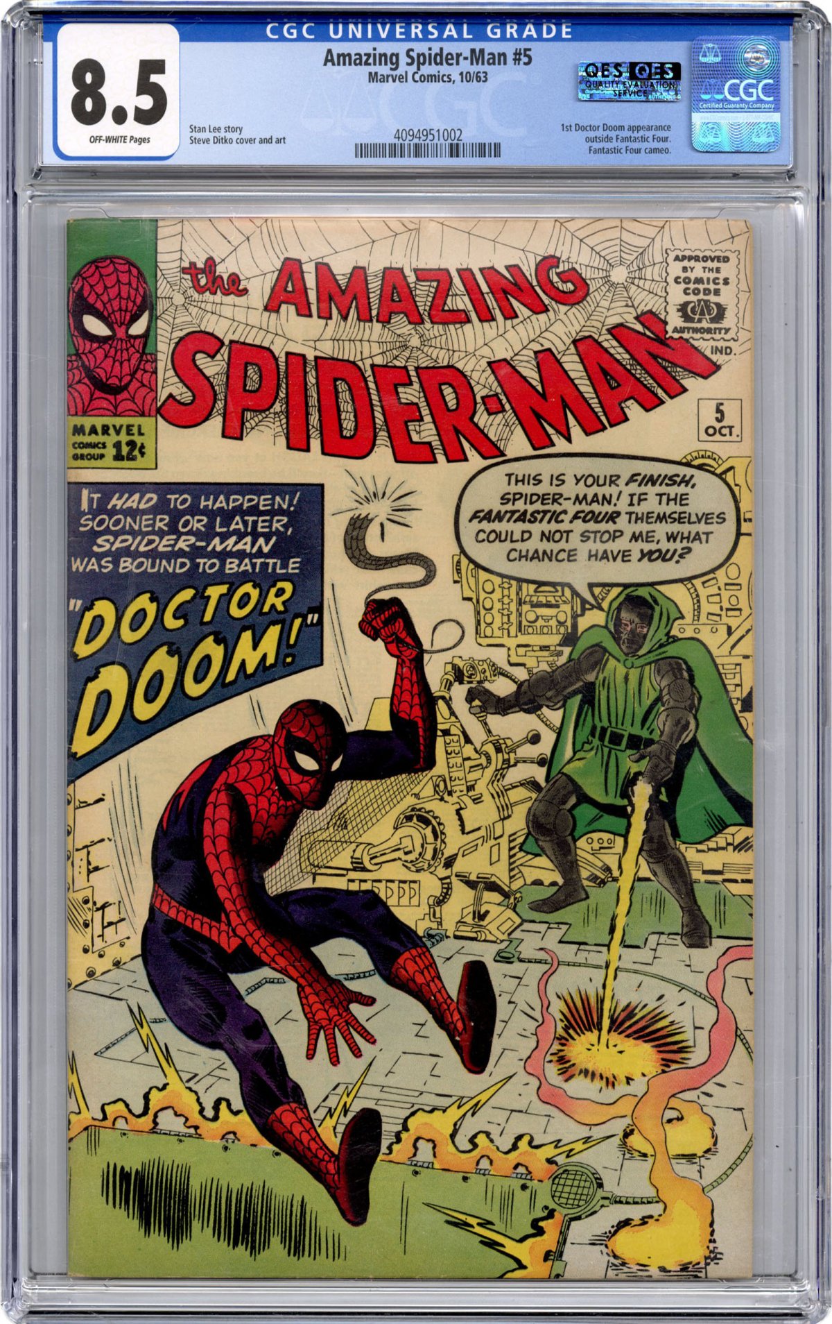 Amazing Spider-Man #5 became a true fan favorite as Spider-Man faced off with Fantastic Four nemesis Dr. Doom — making his 1st appearance outside of the FF series! The action starts courtesy of J. Jonah Jameson offering a $1,000 bounty for Spider-Man's secret identity, which has Dr. Doom thinking that he can recruit Spider-Man to help battle the Fantastic Four. Before the action's all over, we have the first appearance of one of Dr. Doom's robotic clones, along with Flash Thompson in a Spider-Man suit and Peter Parker getting interested in Betty Brant. There's also a classic cameo as the befuddled Fantastic Four stop by after the fighting's all over. Dr. Doom is enjoying unprecedented attention right now as Robert Downey Jr.' prepares to play the character in the upcoming Avengers: Doomsday and Avengers: Secret Wars, with as a renewed wave of investors clamor for collectibles featuring the iconic villain!