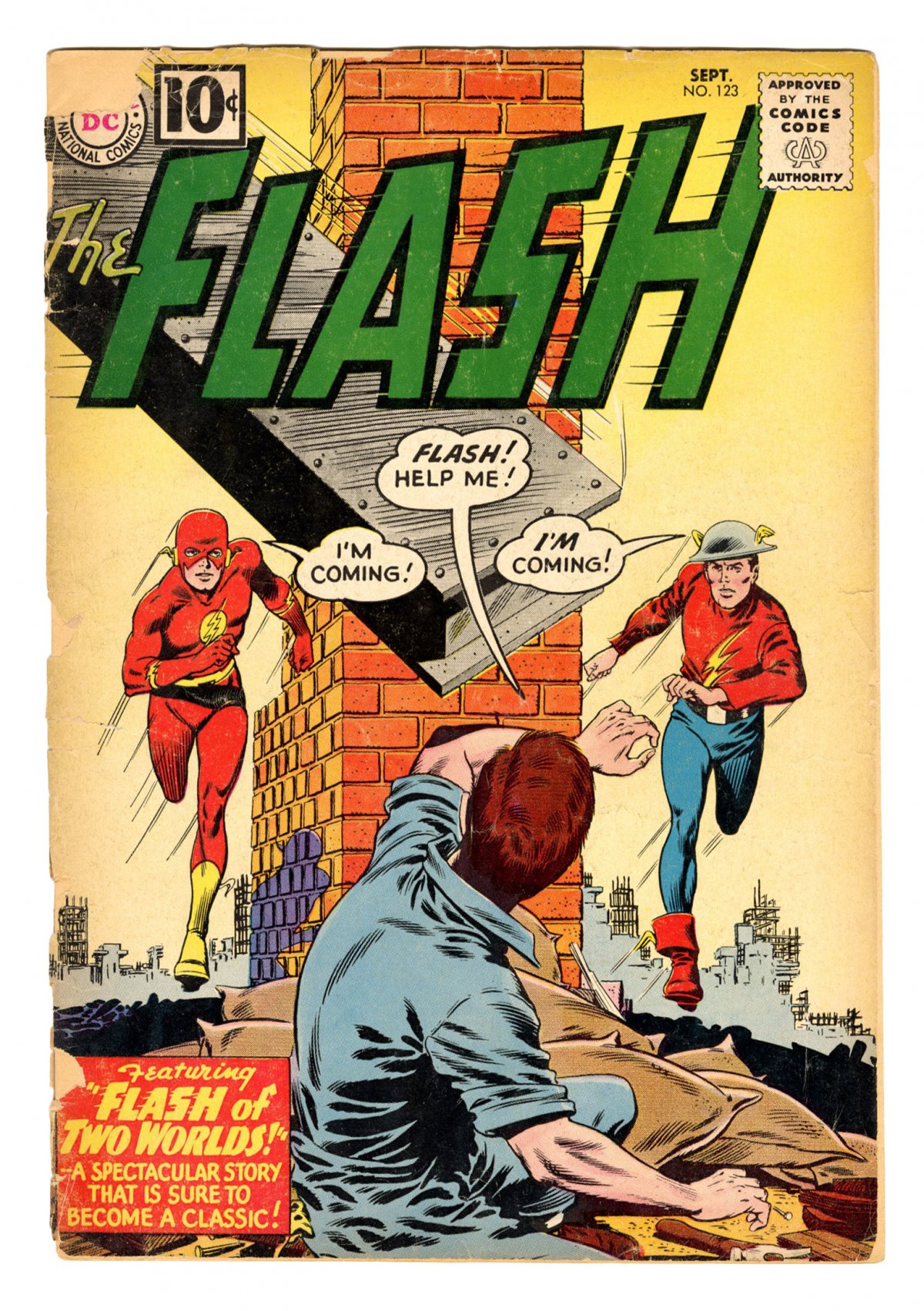 re-intro Golden Age Flash; THE VERY BEGINNING OF THE MULT-VERSE; classic "Flash of Two Worlds" cover; 1st Earth II; COMIC BOOK IMPACT rating of 10 (CBI)