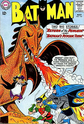 Moldoff cover/art; 1st SA Penguin; COMIC BOOK IMPACT rating of 7 (CBI)The Moldoff design on this comic's cover is a real feast for the eyes, as the Penguin attacks the Dynamic Duo with a giant dragon contraption. It was covers like this one that kept Batman's sales up during the onset of the Marvel Age. Loyal readers stuck with DC's iconic heroes through thick and thin, and this issue is a particular fave of Dark Knight devotees, and for good reason!