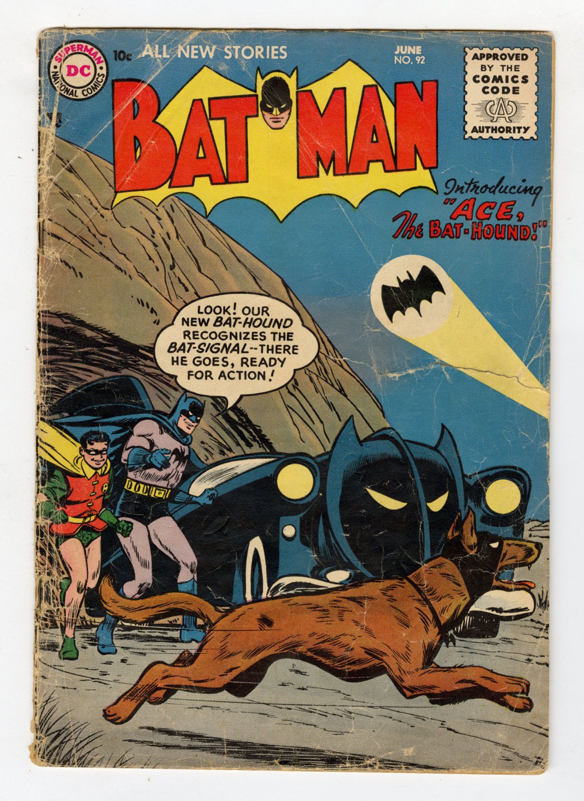 Win Mortimer cover; Sheldon Moldoff pencils; 1st app/Origin of Ace the Bat-Hound; COMIC BOOK IMPACT rating of 7 (CBI)Cover by Win Mortimer. "Fan-Mail of Danger!" script by Bill Finger, pencils by Sheldon Moldoff, inks by Charles Paris; Swamped by fan mail, Batman hires a secretary to handle all of it, who, unwittingly, causes the volume of mail to increase, thus hampering the Caped Crusader's war on crime; A threat from a forger, who has obtained an example of Batman's signature and who attempts to uncover Batman's true identity from it, has to be stopped in his tracks. 2/3-page Casey the Cop story by Henry Boltinoff. "Batman's Guilty Neighbor!" script by Dave Wood, pencils by Sheldon Moldoff, inks by Charles Paris; Bruce's new neighbor, Cal Tremont, is suspected in a series of crimes and it's up to the Caped Crusader to track down the guilty party and clear Cal's name. 2-page Casey the Cop story by Henry Boltinoff. College for Camera Cops article by Jack Miller. -page Shorty story by Henry Boltinoff. First appearance of Ace, the Bat-Hound in "Ace, the Bat-Hound!", script by Bill Finger, pencils by Sheldon Moldoff, inks by Stan Kaye; When Batman and Robin find an injured dog they they take it back to the Batcave; The dog helps them with a few cases and leads them to the crooks who kidnapped his master.