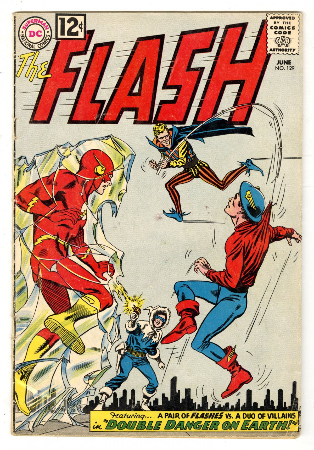 2nd Golden Age Flash; 1st SA app. JSA in flashback; Carmine Infantino cover; Murphy Anderson inks. COMIC BOOK IMPACT rating of 7 (CBI)An incredibly complex plotline in this issue sees the Flashes of Earths 1 & 2 battling a duet of their most pesky enemies, Captain Cold and the Trickster. There is a threat to the Earth of Jay Garrick in the form of a deadly radioactive meteor, which Garrick devines can be averted by a certain radiation-absorbing metal that only exists in Barry Allen's dimension, upon travelling there he become embroiled in a caper at a masquerade ball where there are a lot of confusing hero and villain costumes, but the Captain Cold and Trickster disguises turn out to be real. To make a long story short, the two Flashes capture the bad guys and save the world, the Jay Garrick one, because there are in fact two. This second team-up of the GA and SA Flash is a cult classic fave.