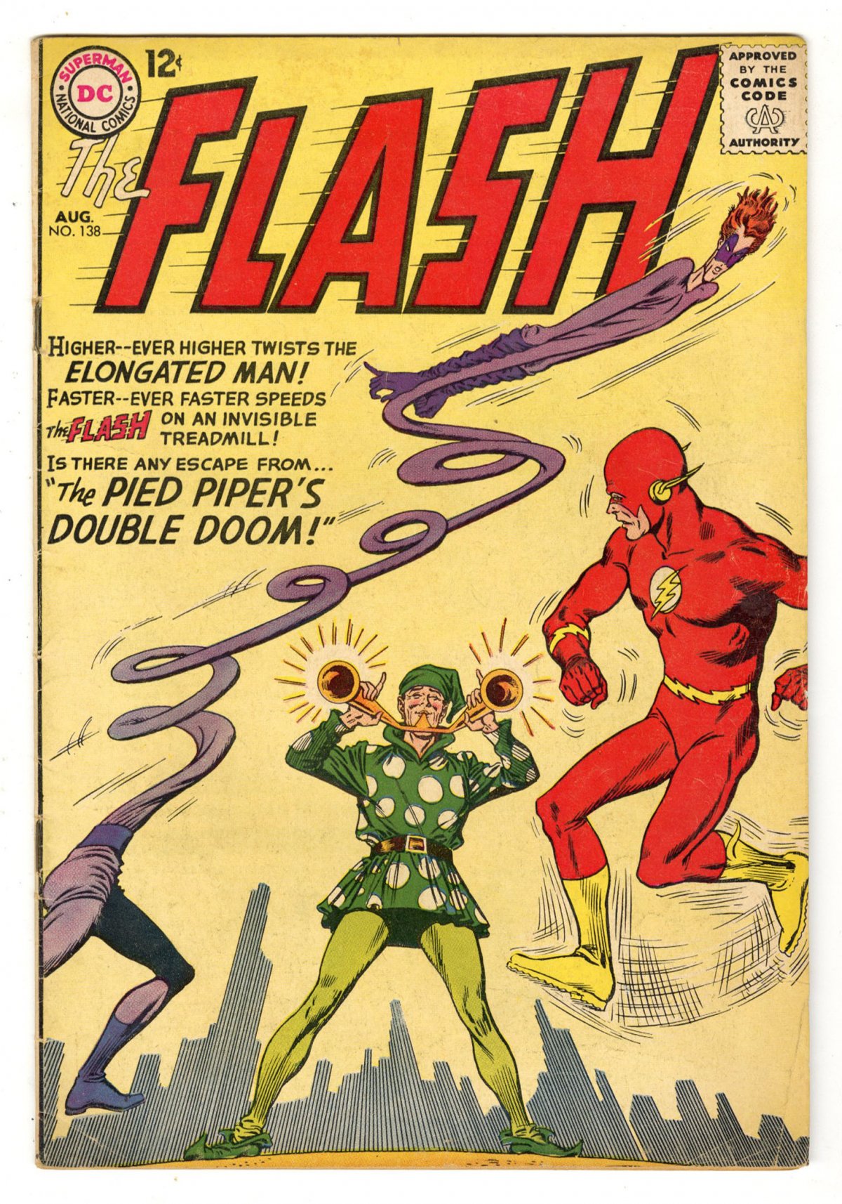 Carmine Infantino cover; Murphy Anderson/Joe Giella inks; Elongated Man,Pied Pipper app; COMIC BOOK IMPACT rating of 6 (CBI)Cover pencils by Carmine Infantino, inks by Murphy Anderson. The Pied Piper's Double Doom!, script by Gardner Fox, pencils by Carmine Infantino, inks by Joe Giella; The Pied Piper uses his musical control to force both The Flash and The Elongated Man to commit robberies and forget they did so, but the heroes meet while trying to solve each others' crimes and realize the Pied Piper is behind the scheme, and defeat him. How NOT To Enjoy A Vacation! public service announcement, script by Jack Schiff, art by Ruben Moreira. Letter from super fan Jerry Bails regarding the relative merits of the current Flash stories vs. the stories from the 1940's.