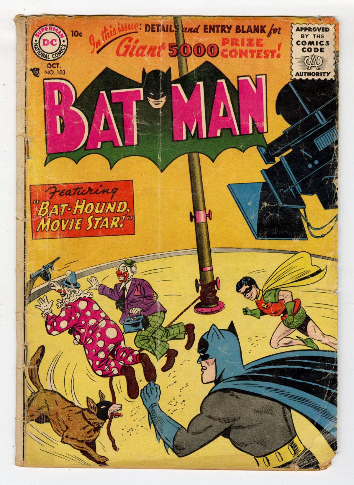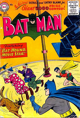 Moldoff Bat-Hound vs clowns battle cover; COMIC BOOK IMPACT rating of 6 (CBI)