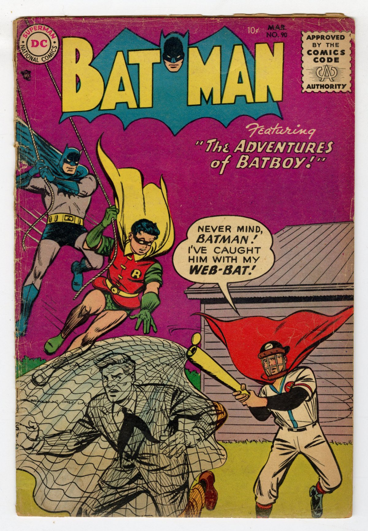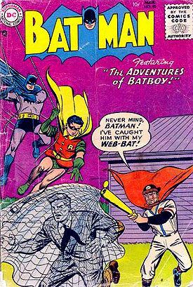 scarce; baseball cover, kind of, sort of, close enough; COMIC BOOK IMPACT rating of 5 (CBI)Cover by Win Mortimer. "The Web of Doom!", script by Bill Finger, pencils by Sheldon Moldoff, inks by Charles Paris; Dr. Peter Driscoll suffers from amnesia and cannot remember where he dropped a parcel with deadly microbes; Batman and Robin hopes to jog his memory by confronting him with three prisoners who served as his test subjects during the microbe research. One-page Casey the Cop story by Henry Boltinoff. "City of Fantasy!", script by Bill Finger, art by Dick Sprang; Dr. Frank Bolton has invented an "illusion ray," but his assistant Parker steals it and partners up with gangsters in order to distort people's vision and commit crimes; At first, Batman and Robin are helpless, until they learn to rely on hearing and radar instead of vision. One-page Professor Eureka story by Henry Boltinoff.