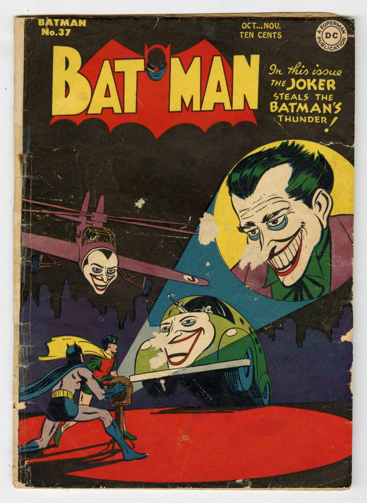 classic Jerry Robinson black Joker cover; scarce; COMIC BOOK IMPACT rating of 7 (CBI)In this entertaining issue of Batman, the cover shows a variety of Joker-themed vehicles converging on the Dynamic Duo, the reference is to an interior tale where the Clown Prince of Crime assumes all of the hallmarks of Batman, particularly a Joker-signal, which alerts the villain to criminal opportunities, which he attends in a Jokermobile, and Jokercopter, both making their debut in this exciting issue. Beyond the awesome Jerry Robinson cover, the issue also contains the usual tales of derring-do, including a yarn where Batman gets shot in the knee, causing Bruce Wayne to suspiciously hobble around, almost giving up the whole secret identity thing.