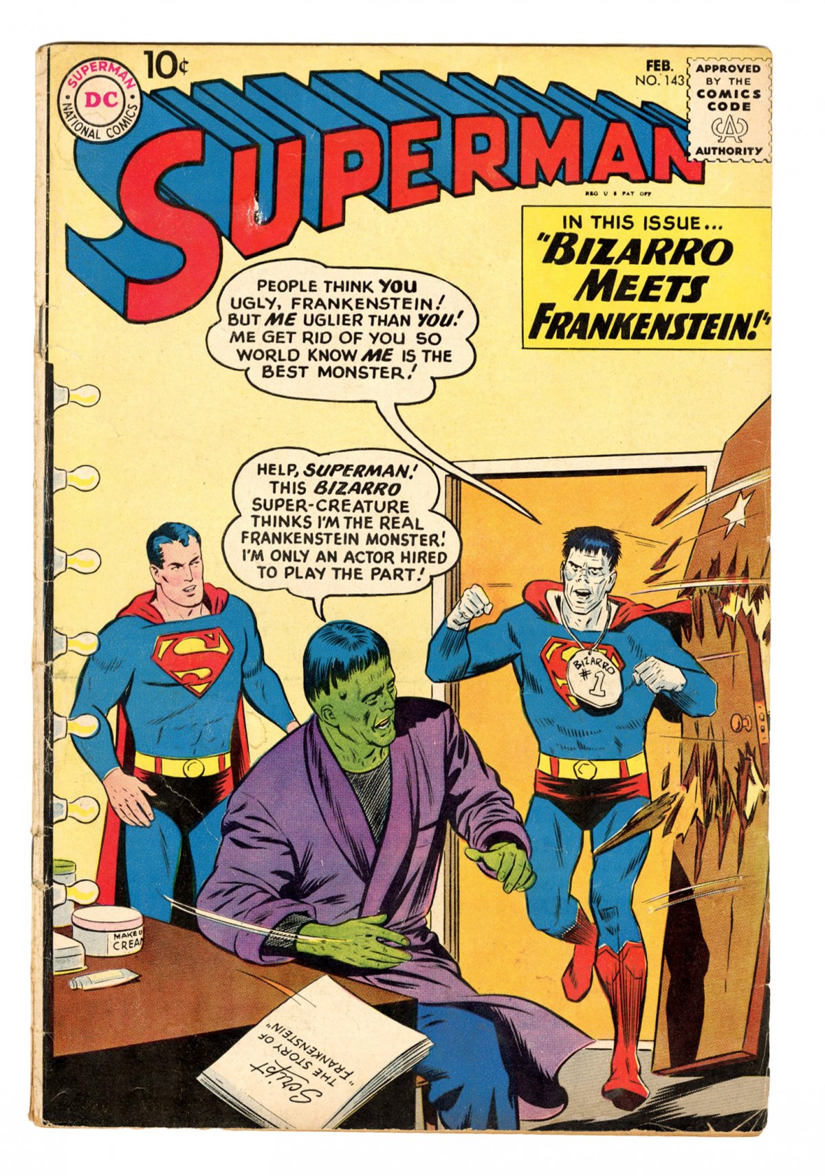 classic Curt Swan Bizarro vs. Frankenstein cover; COMIC BOOK IMPACT rating of 6 (CBI)Cover pencils by Curt Swan, inks by Stan Kaye. The Great Superman Hoax!, pencils by Wayne Boring, inks by Stan Kaye; Professor Juris pretends that he is secretly Superman to attempt to steal some Red Kryptonite from Perry White. Lois Lane's Lucky Day!, art by John Forte; Perry White sends Clark and Lois to a carnival to determine if the games are rigged. Bizarro Meets Frankenstein!, script by Otto Binder, pencils by Wayne Boring, inks by Stan Kaye; After seeing an Earth program claiming that Frankenstein was the scariest monster, Bizarro #1 travels to Earth to prove that he is scarier than Frankenstein.