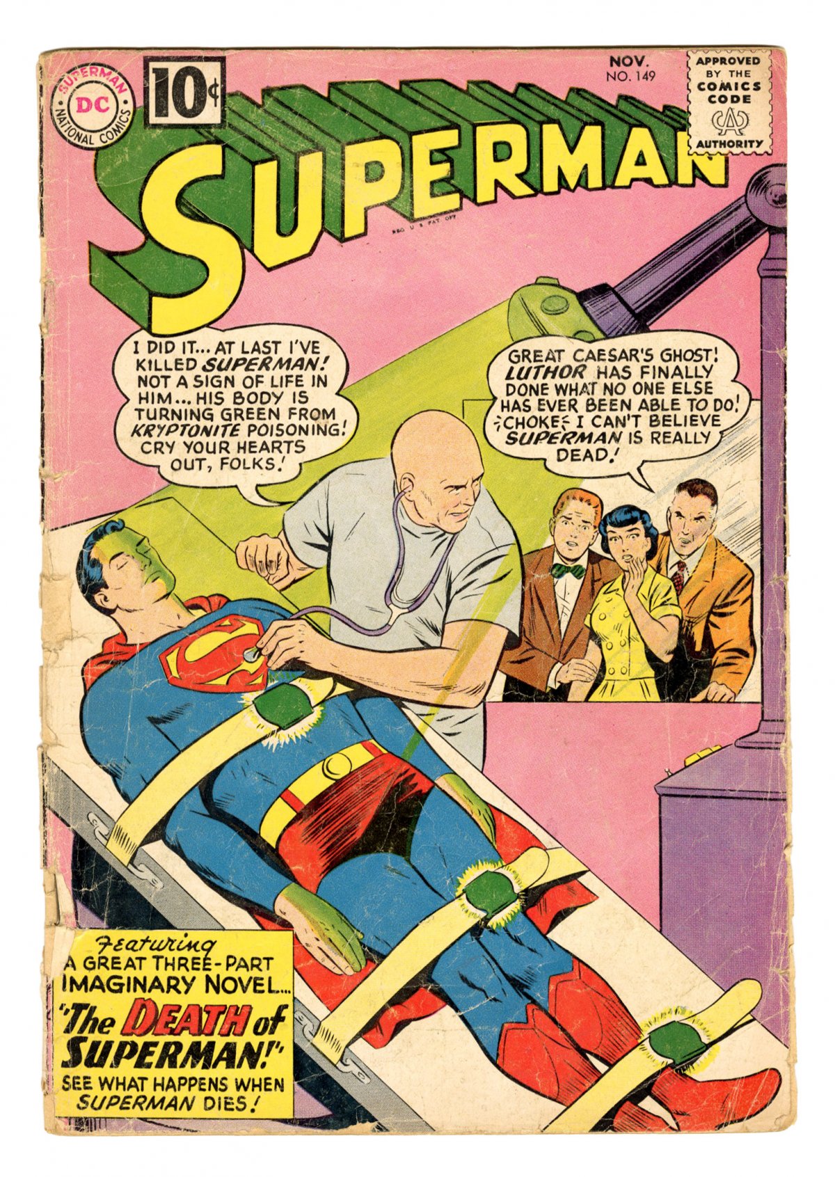 Curt Swan cvr/art; classic Death of Superman cvr/story; COMIC BOOK IMPACT rating of 7 (CBI)Last 10c cover-priced issue. Cover pencils by Curt Swan, inks by Stan Kaye. Lex Luthor, Hero! [The Death of Superman! part 1], script by Jerry Siegel, pencils by Curt Swan, inks by Sheldon Moldoff; Lex Luthor discovers a cure for cancer and with the help of Superman is paroled from prison. Luthor's Super-Bodyguard! [The Death of Superman! part 2]; Lex Luthor reveals that he was only pretending to be good and kills Superman. List of winners of 'The Great Superman Boo-Boo Contest' from Superman #145; Includes some panels and examples of the errors in that story; Winners got original Superman drawings; First place found 456 errors. The Death of Superman! [part 3]; Superman is buried, and Supergirl brings Lex Luthor to justice.