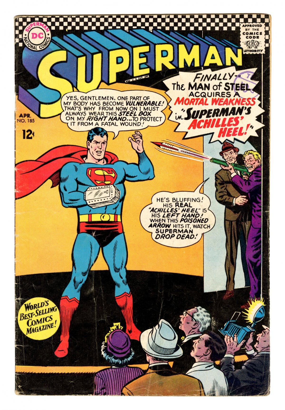 Swan c/a; COMIC BOOK IMPACT rating of 5 (CBI)Cover pencils by Curt Swan, inks by George Klein. Superman's Achilles' Heel!, art by Pete Costanza; The Man of Steel resorts to wearing a steel box on his right hand after Red Kryptonite gives him a vulnerable "Achilles' Heel". Target Superman! [part 1], art by Jim Mooney; Rich Dolores Rivera uses her fortune to try to snare Superman. The Irresistible Clark Kent! [part 2]; Vol-Don of the Look-Alike Squad of Kandor impersonates Clark Kent to help Superman.