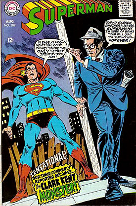 Swan art (8/68)Cover pencils by Ross Andru, inks by Mike Esposito. The Clark Kent Monster!, script by Cary Bates, pencils by Curt Swan, inks by Jack Abel. The Super-Servant of Crime, script by Robert Bernstein, pencils by Curt Swan, inks by John Sikela; When Mark Mulloy, the owner of property from which Superman has been mining gold, returns to claim his rights, Superman agrees to perform six tasks for him as compensation; But Superman interprets Mulloy's requests so literally that Mulloy can't benefit from the deal.