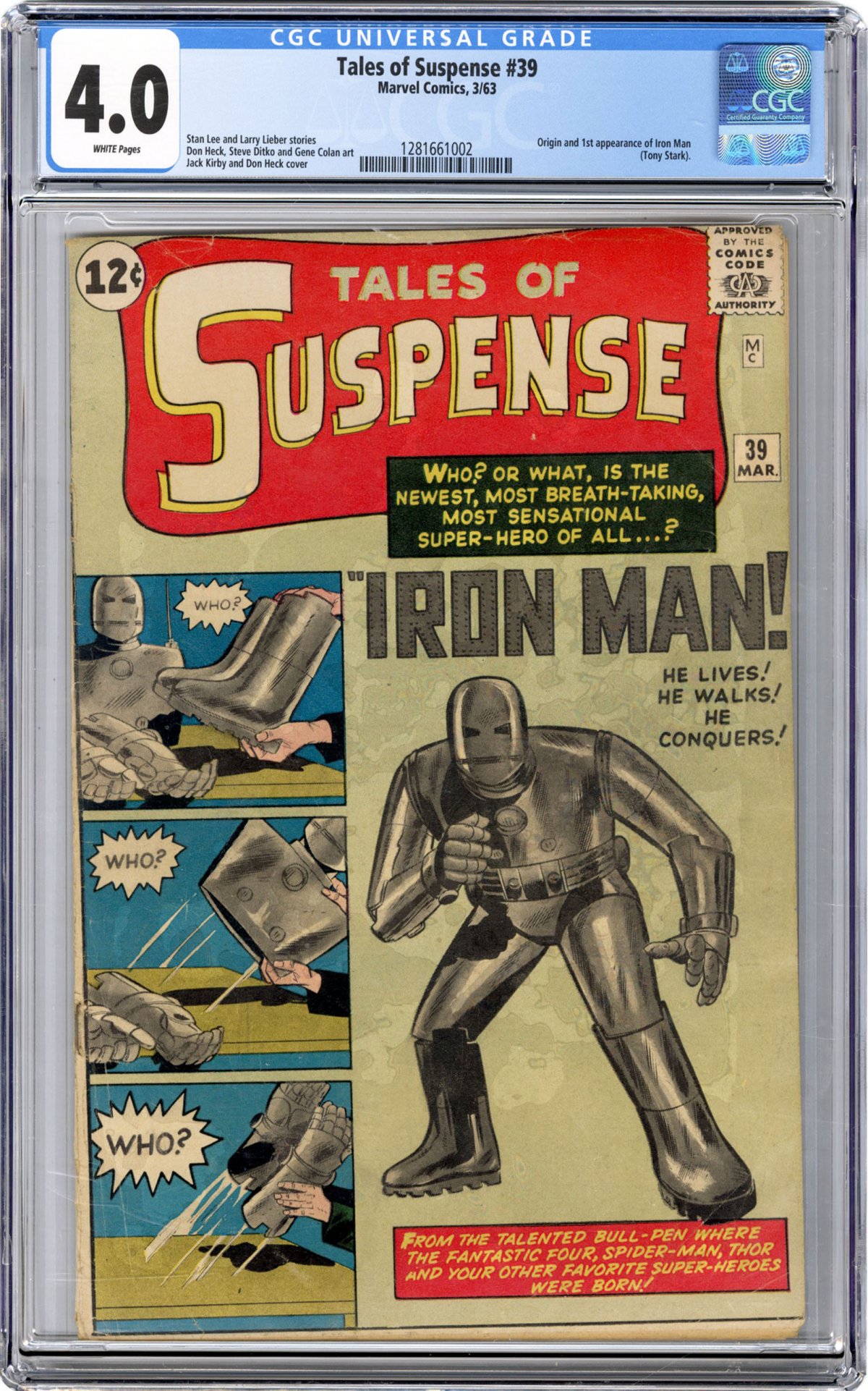 1st appearance of Iron Man (Tony Stark) w/ origin; Jack Kirby cover; Steve Ditko art; COMIC BOOK IMPACT rating of 10 (CBI)