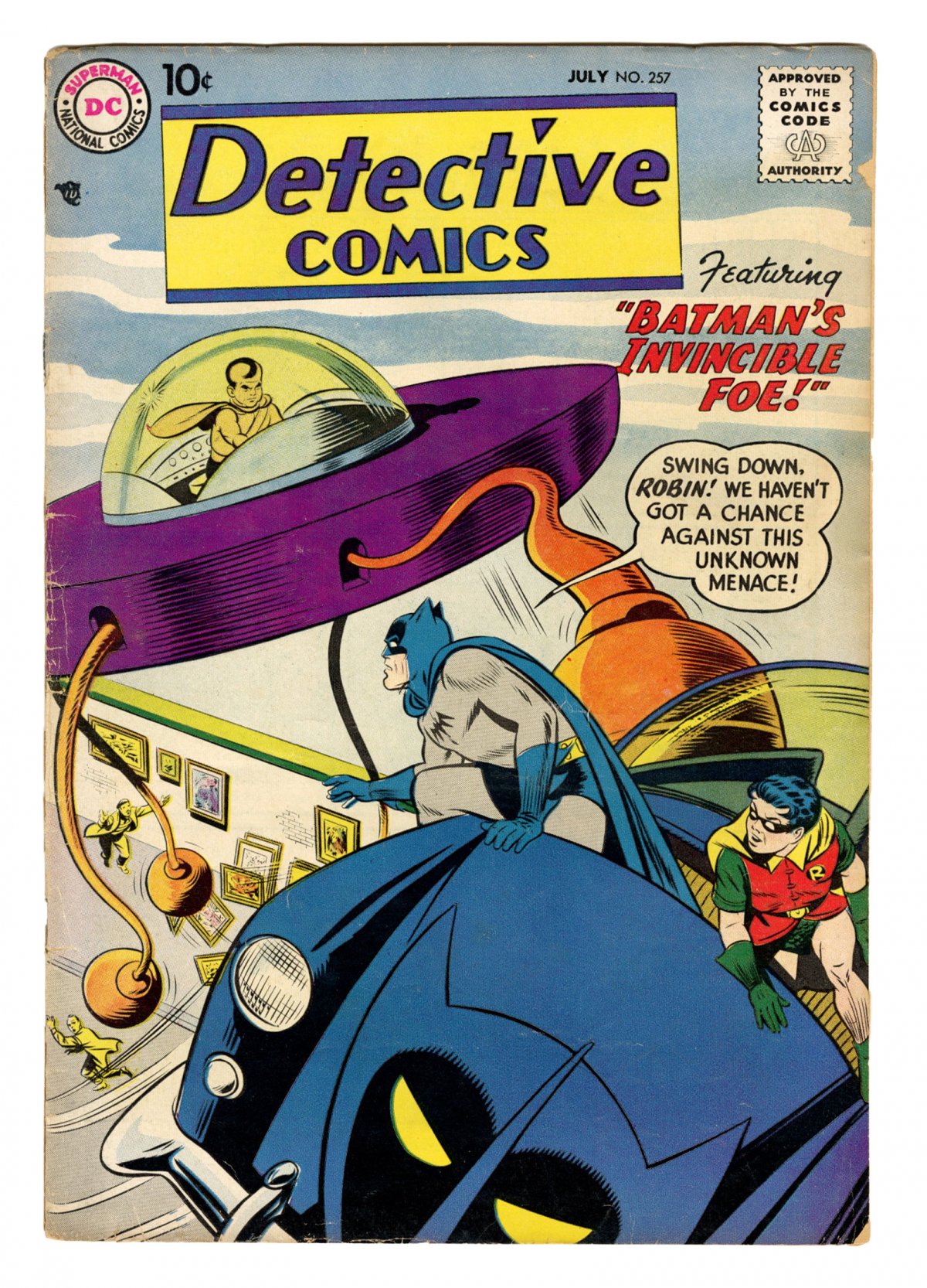 sci-fi cover; Intro & 1st app. Whirly Bats; COMIC BOOK IMPACT rating of 6 (CBI)Cover pencils by Curt Swan, inks by Stan Kaye. Are You a Litter-Bug? public service announcement, art by Henry Boltinoff. Intro and 1st appearance of Whirly Bats in "Batman's Invincible Foe" starring Batman and Robin, pencils by Sheldon Moldoff, inks by Charles Paris; A criminal and a policeman from the future draw Batman into the middle of their battle; vs. Karko. Warden Willis two-pager by Henry Boltinoff. "The Return of Cleopatra" starring Roy Raymond TV Detective, art by Ruben Moreira; Roy battles Hamid. Batman Whirly-Word Game activity page. "King of the Underworld!" starring John Jones Manhunter from Mars, art by Joe Certa; There's a gang war to determine who will take Willy Wanger's place, and Jones is determined to win. "O'Malley of the 4th Precinct" one-page story, script and art by Irwin Hasen.