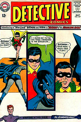 1st historic new look Batman; Infantino begins (5/64); COMIC BOOK IMPACT rating of 7 (CBI)By the mid-1960s, Batman was nearly done for. After three decades of fighting off homicidal clowns, sexy jewel thieves, scarred former friends, and waddling bird enthusiasts, the Caped Crusader was about to be done in by the twin scourges of 1950s/early 1960s anti-comics frenzy and the most dreaded villain of all, plummeting sales. As a result, DC gave editor Julius Schwartz and dependable freelancer Carmine Infantino an ultimatum: you guys have six months to fix this mess, or the Dark Knight gets it.