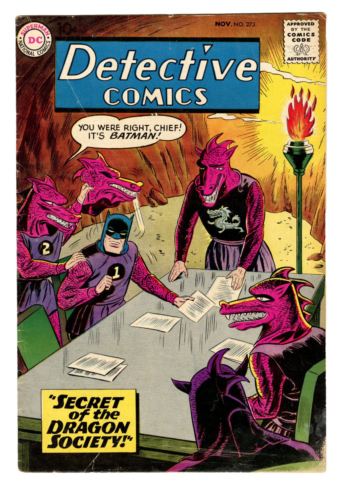 J'onn J'onzz i.d. revealed to Earth (11/59) COMIC BOOK IMPACT rating of 6 (CBI)Cover art by Sheldon Moldoff. "The Secret of the Dragon Society" starring Batman and Robin, pencils by Sheldon Moldoff, inks by Charles Paris; In an address to a group of police academy graduates, Commissioner Gordon tells the story of Batman and Robins battle against the multi-state Dragon Society gang of criminals; The story focuses on how much trouble the criminal gang meant for the heroes, but how they never stopped trying to capture the criminals. New Stars for "Old Glory" public service announcement, script by Jack Schiff, art by Bernard Baily. Warden Willis humor page by Henry Boltinoff. "The Plunderers from Pluto" starring Roy Raymond TV Detective, art by Ruben Moreira; Roy vs. phoney Plutonians. Casey the Cop humor page by Henry Boltinoff. "The Unmasking of J'onn J'onzz" starring John Jones Manhunter from Mars, script by Jack Miller, art by Joe Certa; When a Martian criminal lands on Earth, J'Onzz's presence on Earth is revealed; A Martian weapon takes away his abiltiy to use his other powers while he is invisible.