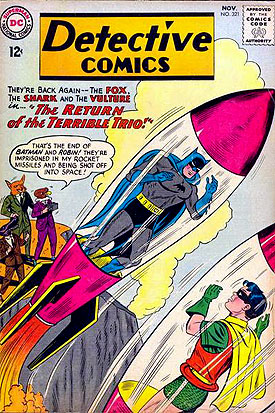Batwoman app. (11/63)Cover art by Sheldon Moldoff. "The Terrible Trio" starring Batman and Robin, pencils by Sheldon Moldoff, inks by Charles Paris; The Terrible Trio break jail and resume their criminal operations on land, sea, and air, forcing Batman and Robin to start a campaign to capture them; Meanwhile, Batwoman learns that some other criminal has escaped as well and she decides to investigate that case; She follows the crook to the lair of the Terrible Trio, but she is not aware that the fugitive is actually Batman, disguised as a crook; Once inside the hideout, Batman contacts Robin with his Utility Belt and they try to capture the Terrible Trio, but they are not prepared to deal with the traps the criminals have rigged in the place; The Trio capture Batman and Robin and place them in rocket ships. Your United Nations at Work public service announcement, script by Jack Schiff, art by Sheldon Moldoff. Cameras That Catch Crooks article. "The Cosmic Creature" starring John Jones Manhunter from Mars, art by Joe Certa; Manhunter battles a shape-changing beast from outer space.