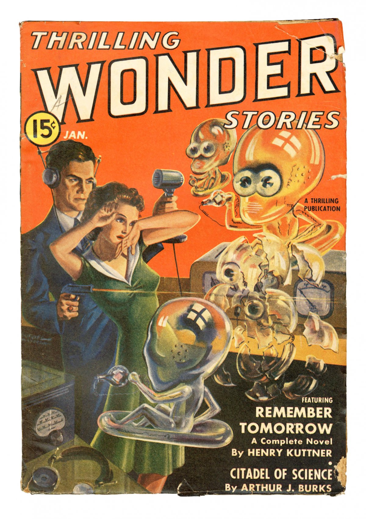 Jan 1941. bizarre alien creature cover by Gabriel Mayorga. Stories by Henry Kuttner, Arthur J. Burks, Raymond Z. Gallun, Alfred Bester, Kelvin Kent, Otis Adelbert Kline, Joseph J. Millard, and Frederick Engelhardt. Scientifacts column by Mort Weisinger.