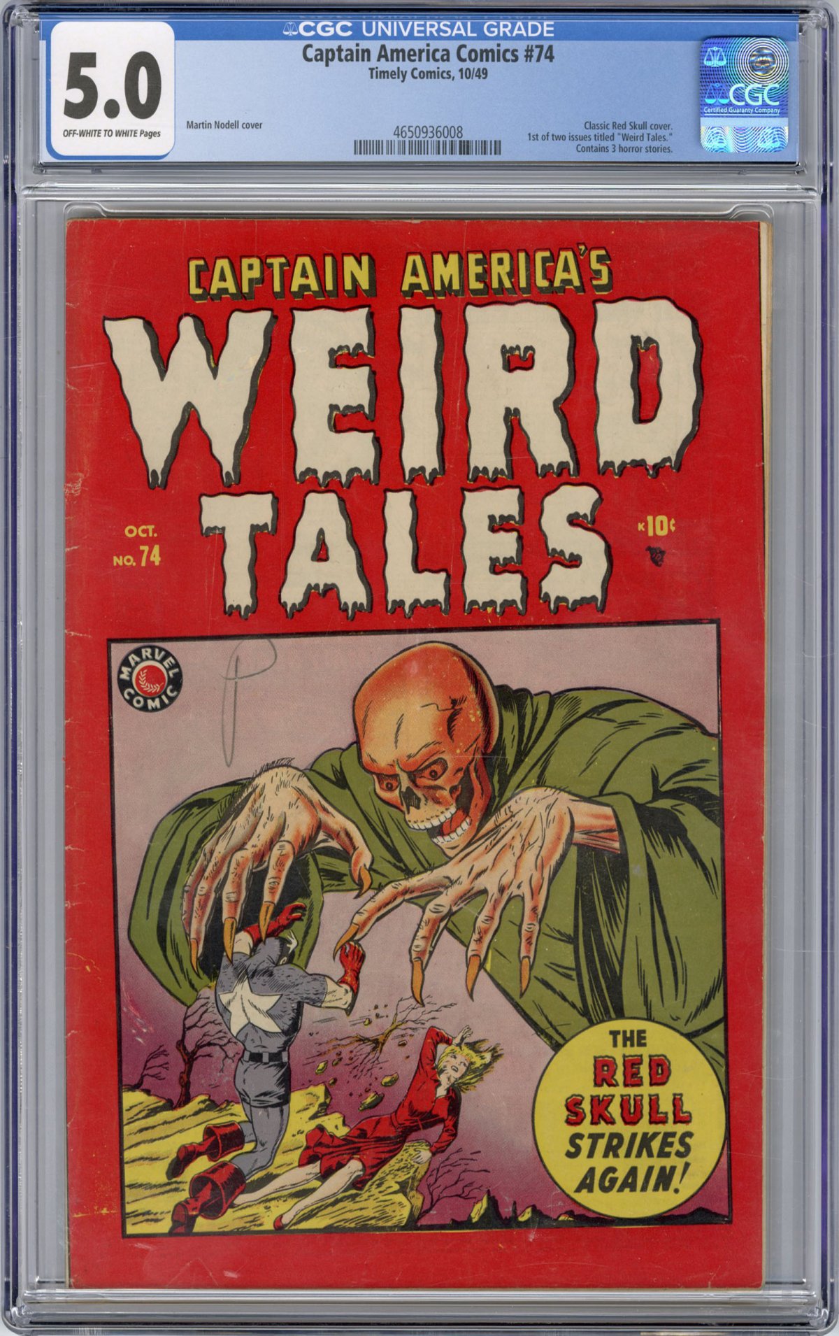 Captain America Comics #74 is exactly what it looks like — an issue featuring the Red Skull, but now packaged as a horror title called Captain America's Weird Tales . By the late 1940s, kids were buying horror comics and superheroes weren't selling. That inspired Timely to rebrand their entire line as "Weird" this and "Astonishing" that. Captain America Comics promptly became Captain America's Weird Tales for two bizarre issues. The first would feature Cap's final appearance of the '40s in this surreal tale of the Red Skull plotting from Hell to have Satan claim Captain America's soul.