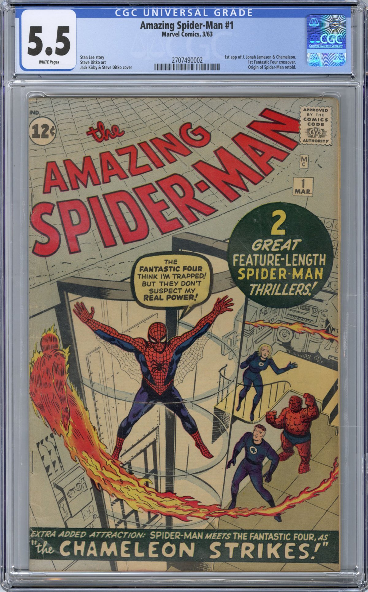 Fantastic Four in their first crossover to bring in new readers.) This first issue has since remained a cornerstone of comic collecting — with co-creators Stan Lee and Steve Ditko bringing in the first appearance of J. Jonah Jameson as one of the most iconic supporting characters in the history of comics. Fans also meet JJJ's astronaut son John, along with seeing The Chameleon's debut as Spidey’s first supervillain.